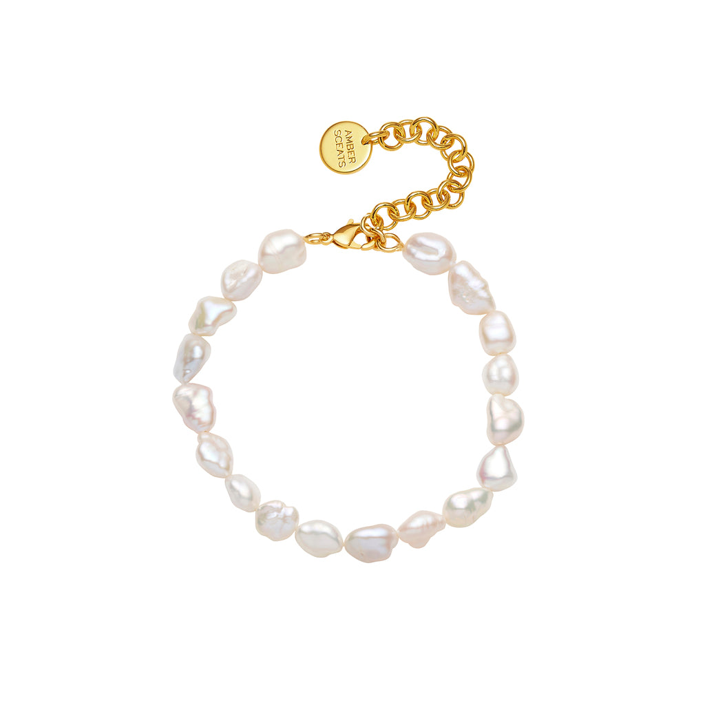 A classic silhouette strung with lustrous freshwater pearls and a 24k gold plated clasp, the elegant SAACHI BRACELET will endure season to season. Handcrafted in Italy.