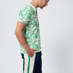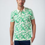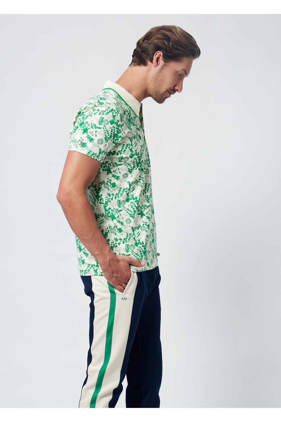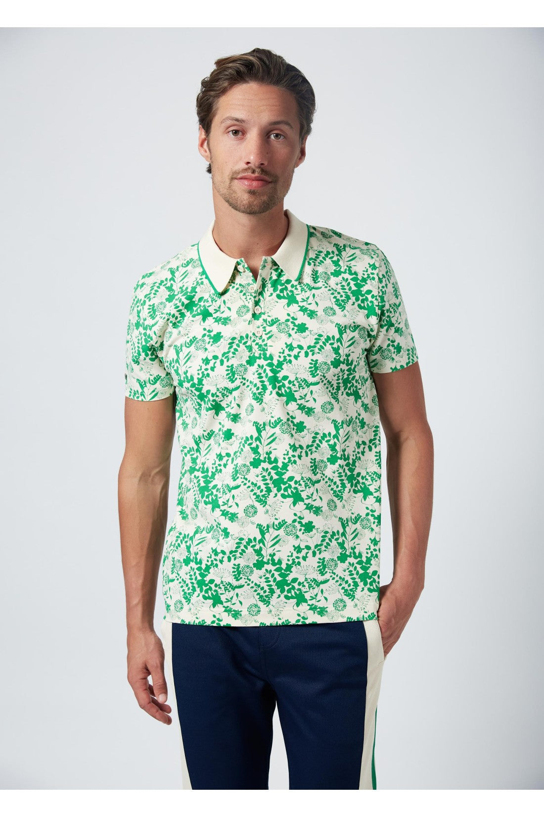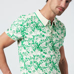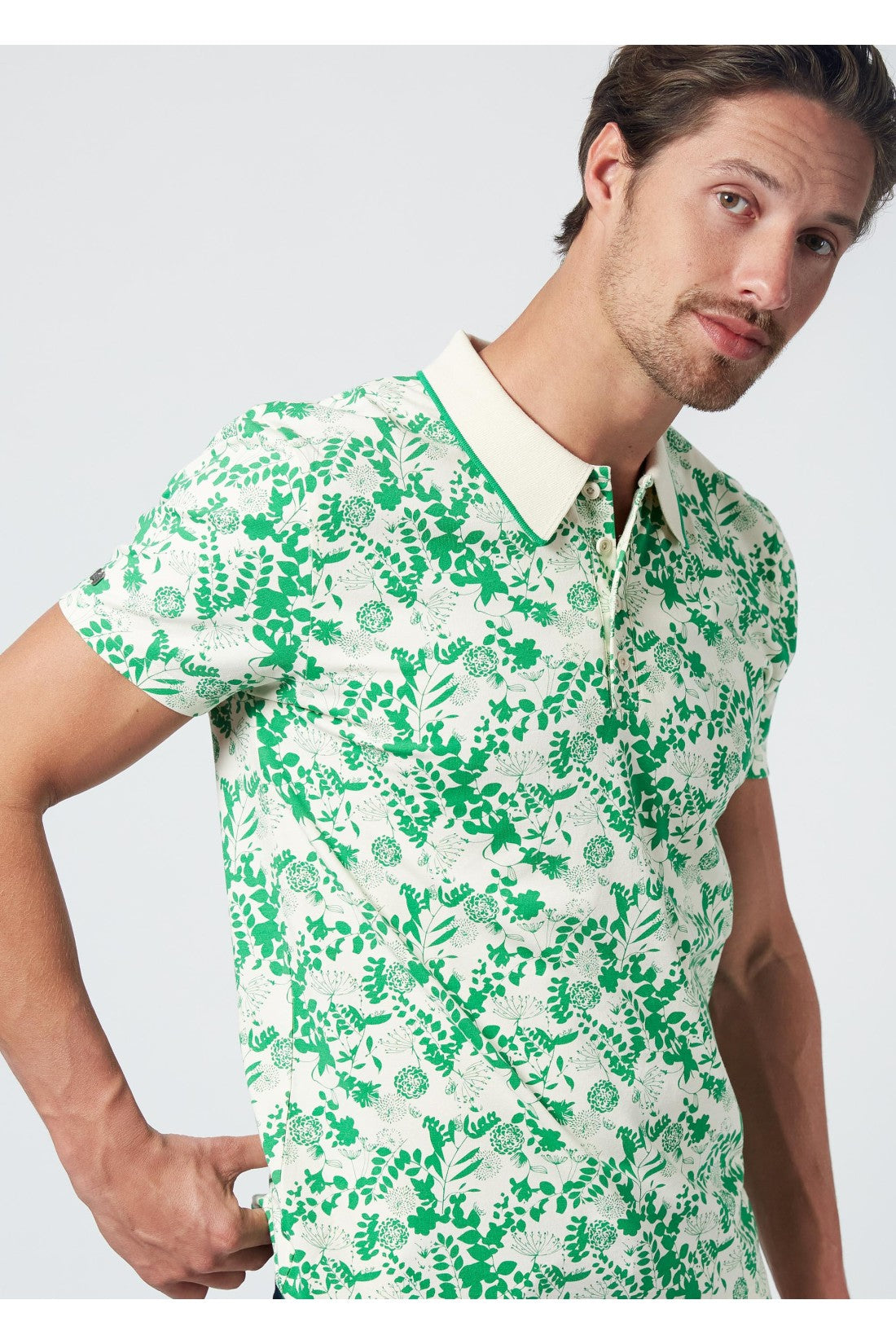 Moliendo Café Polo. An ecru polo with green floral print made of cotton jersey, with short sleeves and button closure.