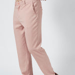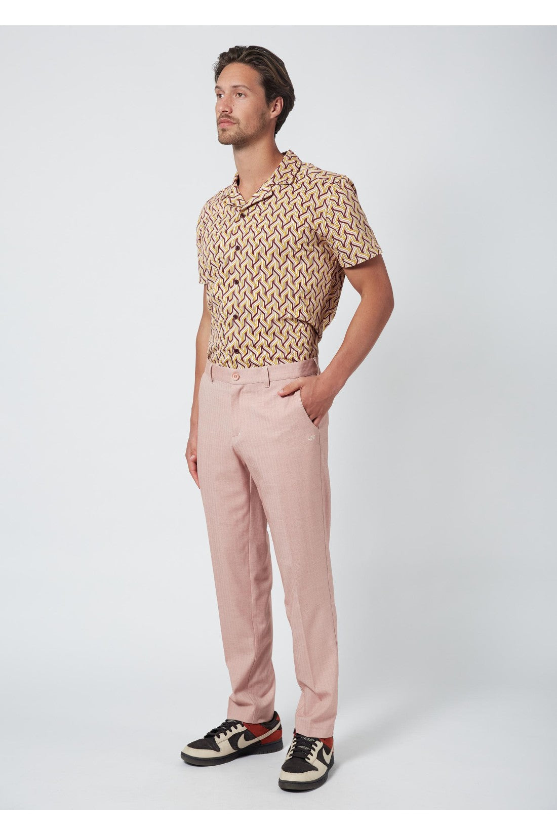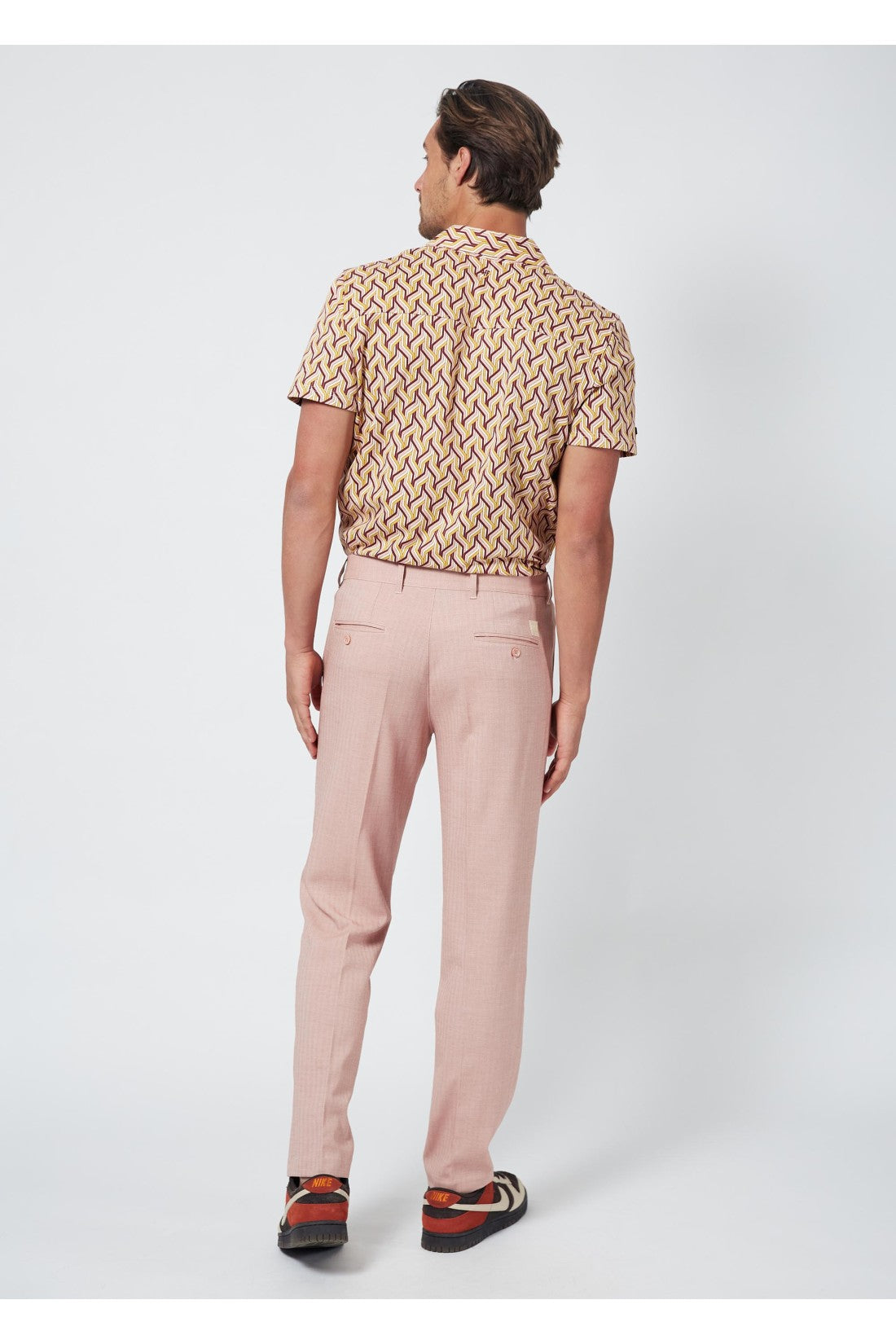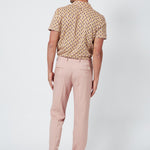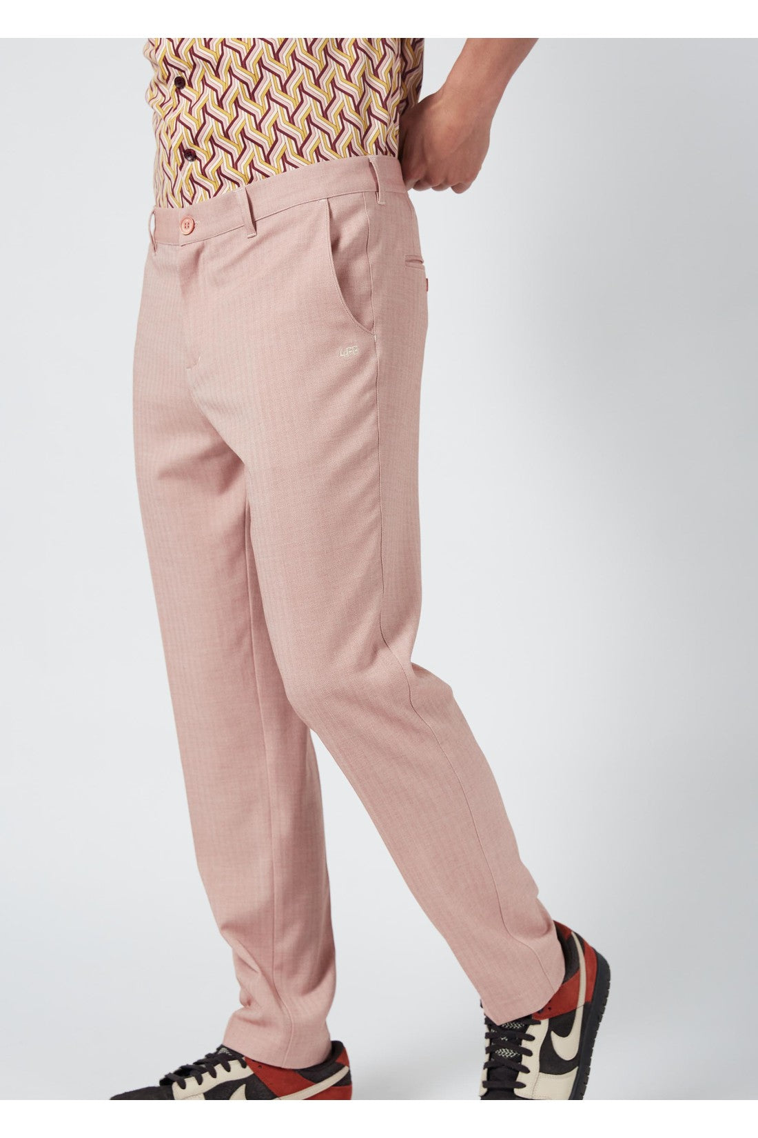 My Old Piano Trousers are light pink trousers with a herringbone motif, side seam pockets in the front, and welt pockets in the back.