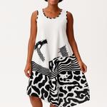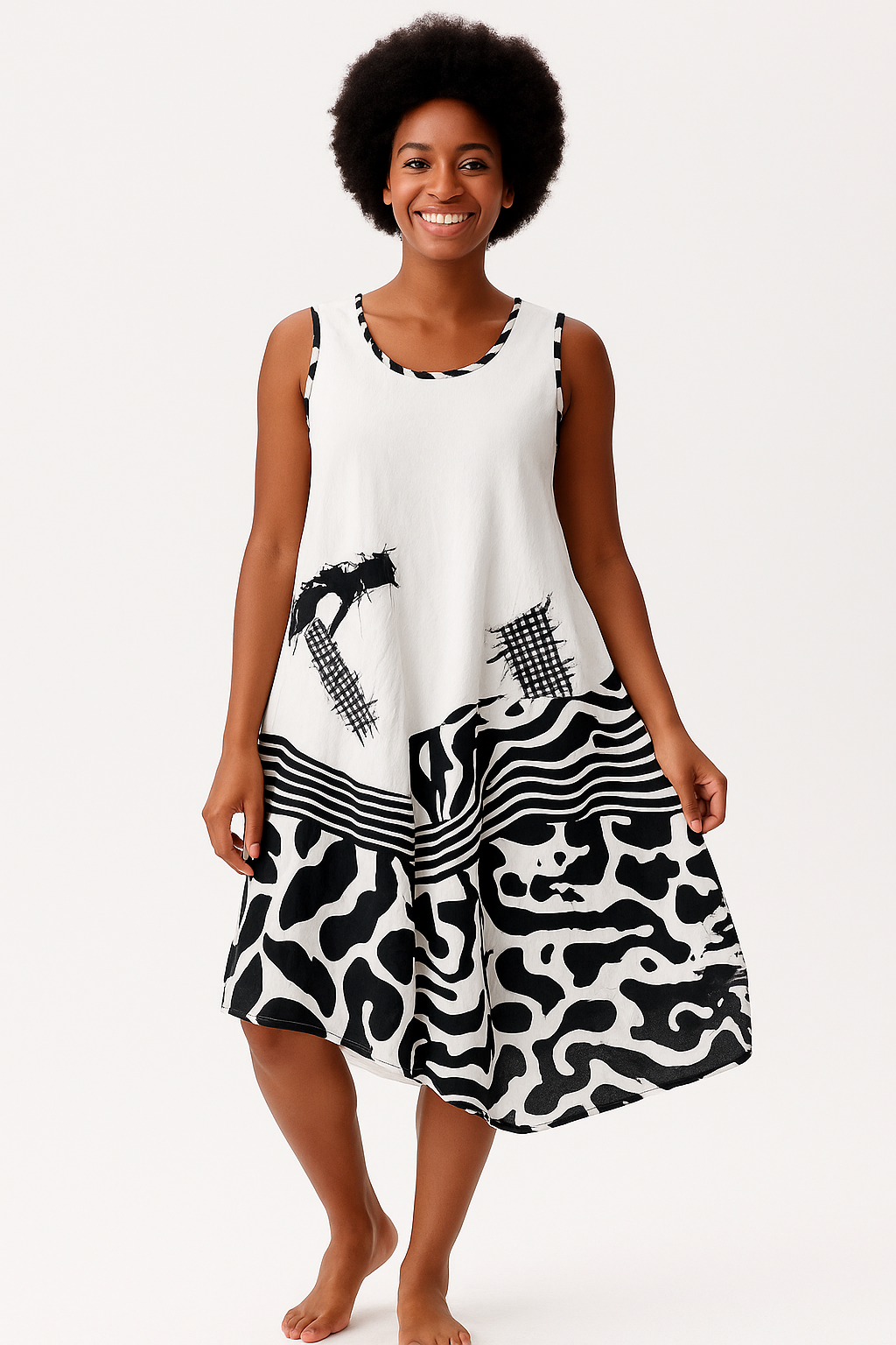 Monochrome Patch Linen Dress is a sleeveless A-line silhouette crafted from 100% natural linen. It features contrast black-and-white patchwork panels in bold stripes, checks, and abstract motifs. The neckline is finished with a twisted contrast trim, adding a subtle artisanal detail.