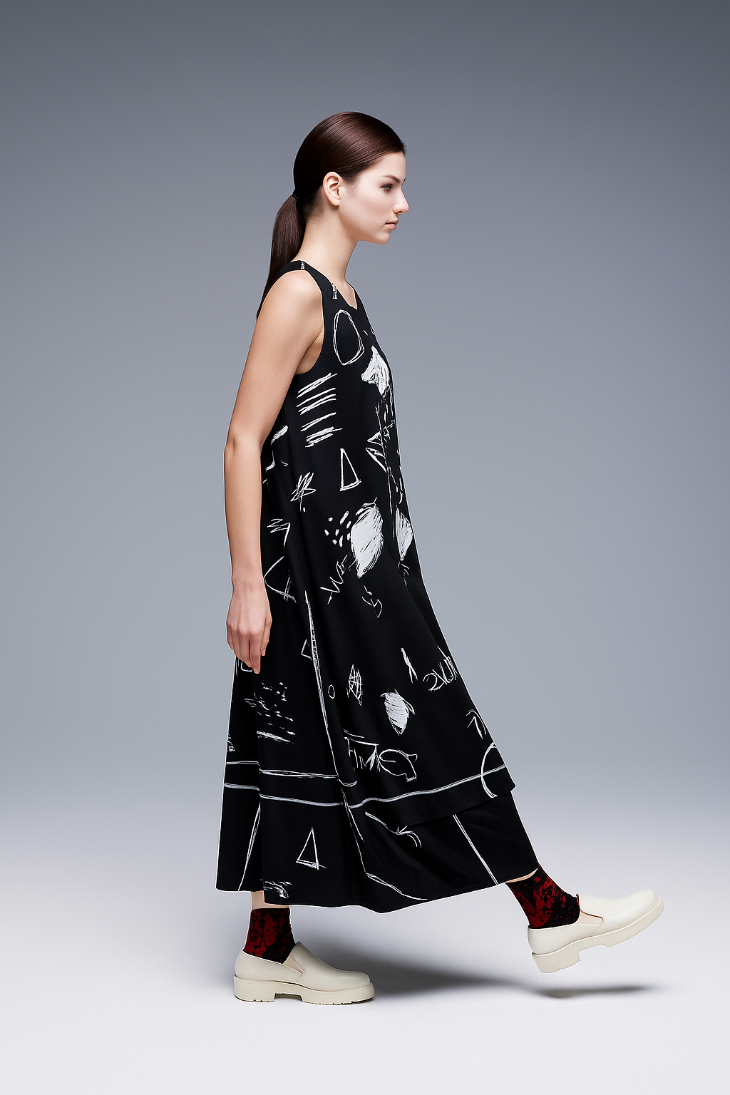 The Abstract Script Dress by Moyuru is a fluid, oversized silhouette that merges comfort with contemporary art. Crafted in Japan, this sleeveless dress features hand-drawn abstract motifs and graphic script prints across a black cotton base. The relaxed cut create effortless movement and drape, while the monochrome palette highlights Moyuru’s modern, expressive style.