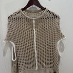 The Open Weave Contrast Knit Top is a lightweight, textured knit featuring a loose, open weave design and crisp white trim at the neckline, sleeves, and hem. Its airy structure and relaxed fit make it perfect for layering over tanks or shirts, offering subtle texture and dimension to any outfit.