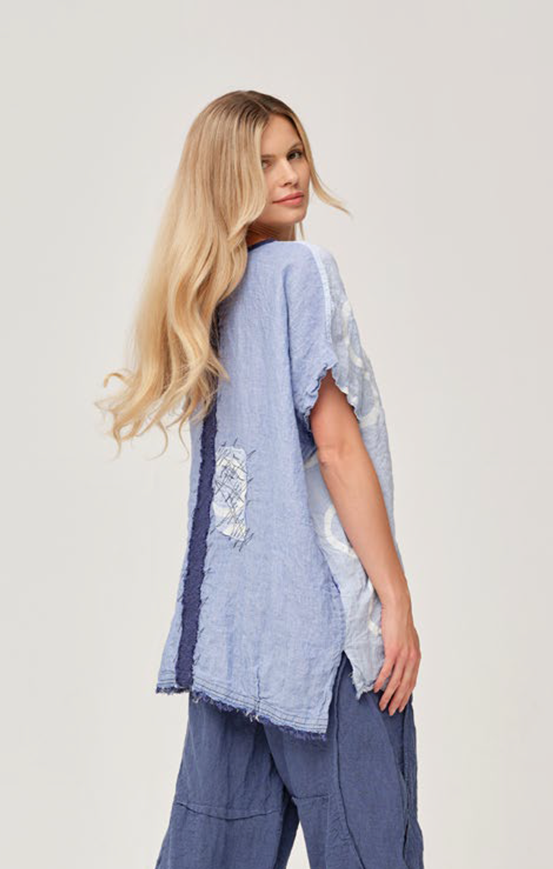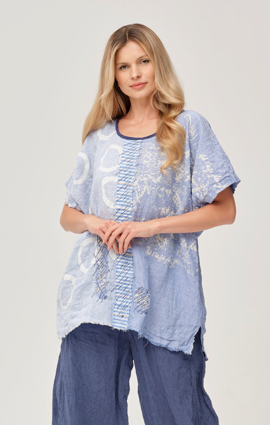 The Sky Stitch Linen Top is crafted in 100% linen and washed in a soft, airy blue with off-white abstract prints. This relaxed-fit short sleeve top features detailed vertical stitchwork down the front in contrasting navy and white thread, with raw edging and subtle patchwork embroidery adding an artisanal touch.