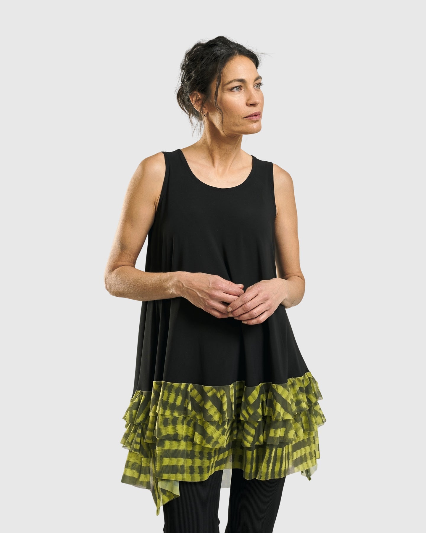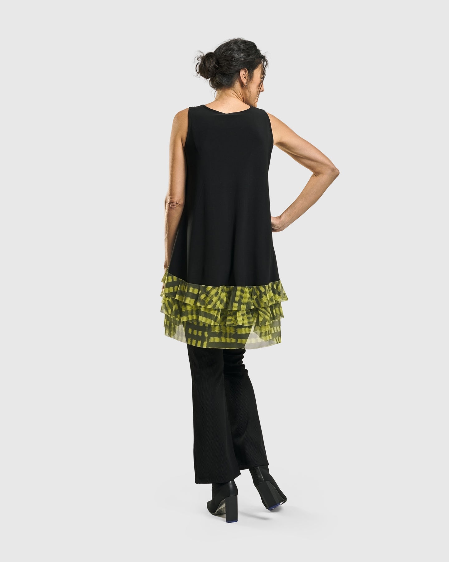 Add some flair to your look in the Busy Bee sleeveless tunic top, made in an ultra-soft jersey mixed with an abstract mesh black and yellow check at the ruffle tiered hem. Features an A-line silhouette and scoop neck.