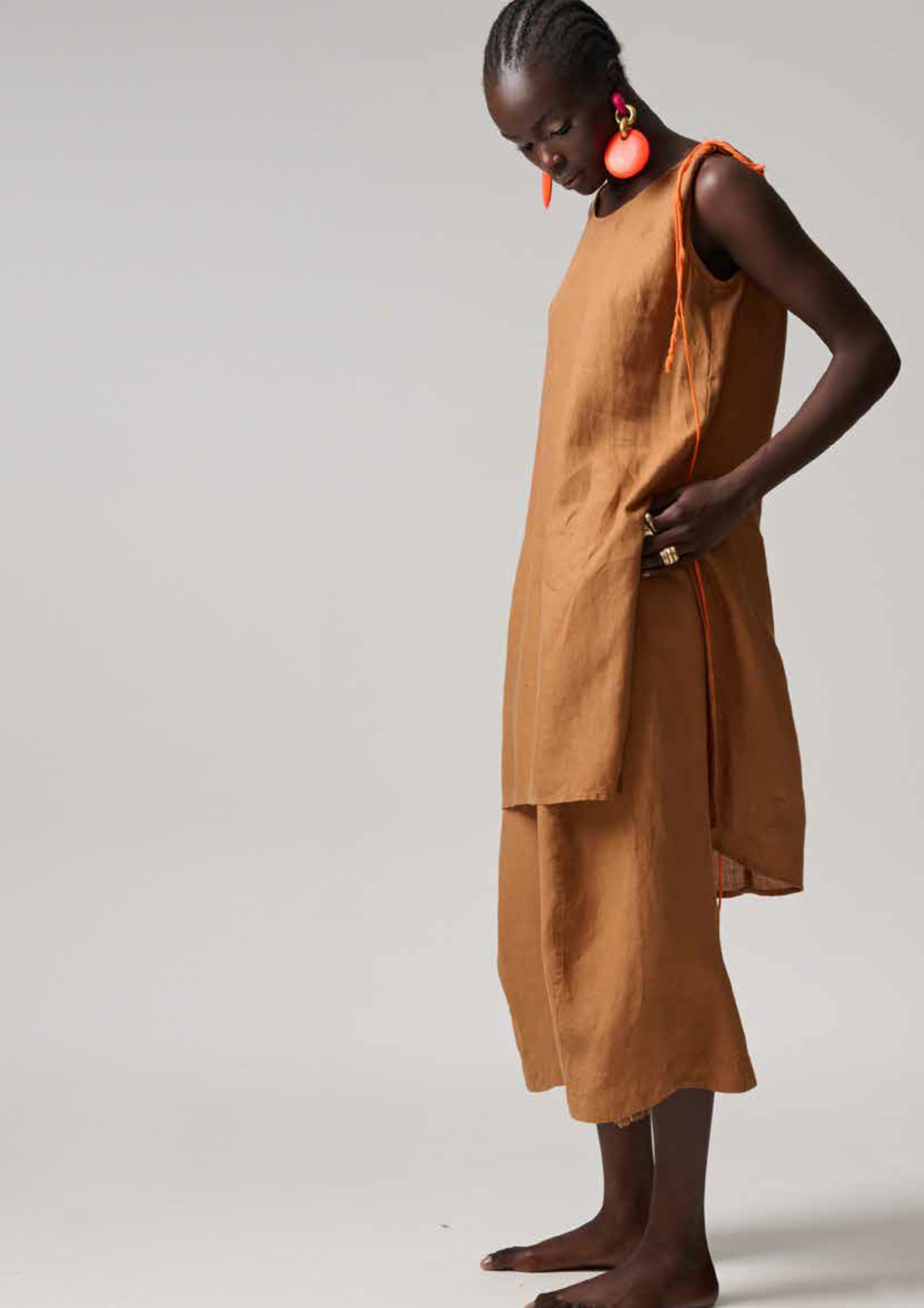 Minimalism with a twist. The Long Tan Cami is a sleeveless linen top that falls into an artful asymmetric hem, draping and moving with relaxed sophistication. Subtle detailing adds just a hint of irreverence, perfect for layering or wearing solo. Quiet luxury, redefined in pure linen.