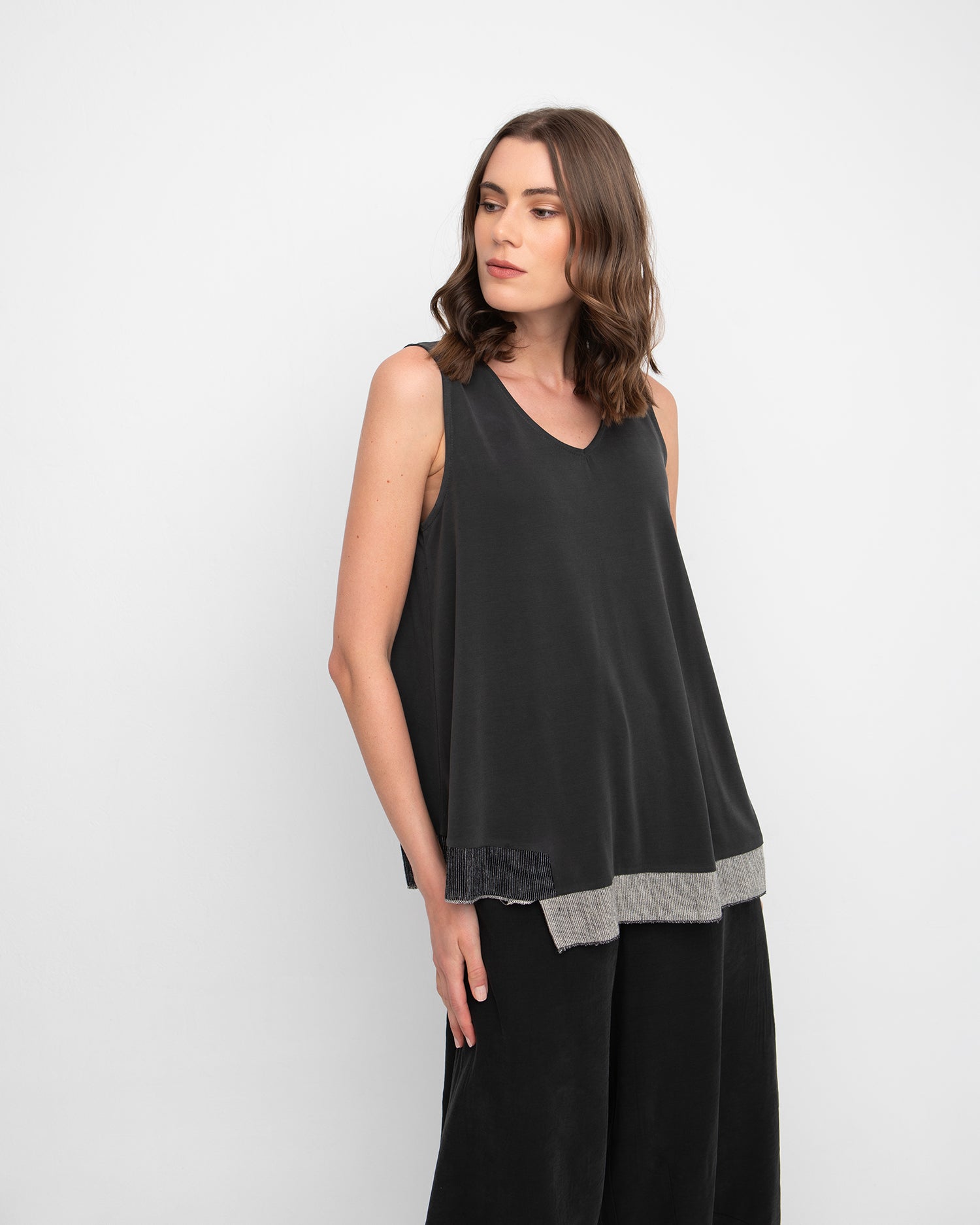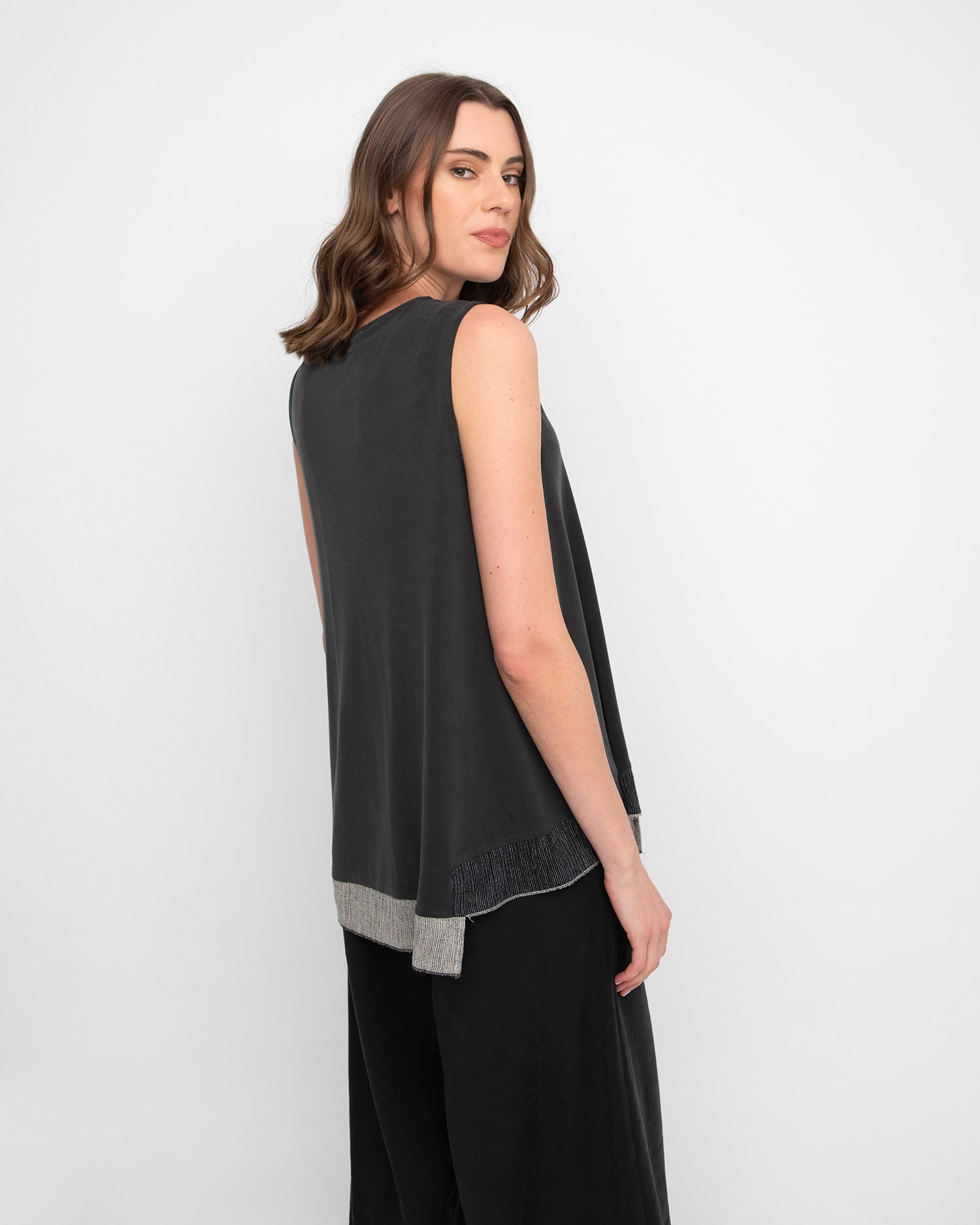 The OZAI Cork Top is a minimalist dream with a touch of texture. Designed with a flowing A-line cut, this sleeveless top offers ease of movement and a flattering drape. The contrasting woven hem adds a subtle yet striking finish, making it a perfect layering piece for contemporary wardrobes. Pair it with wide-leg trousers for a relaxed yet sophisticated look.