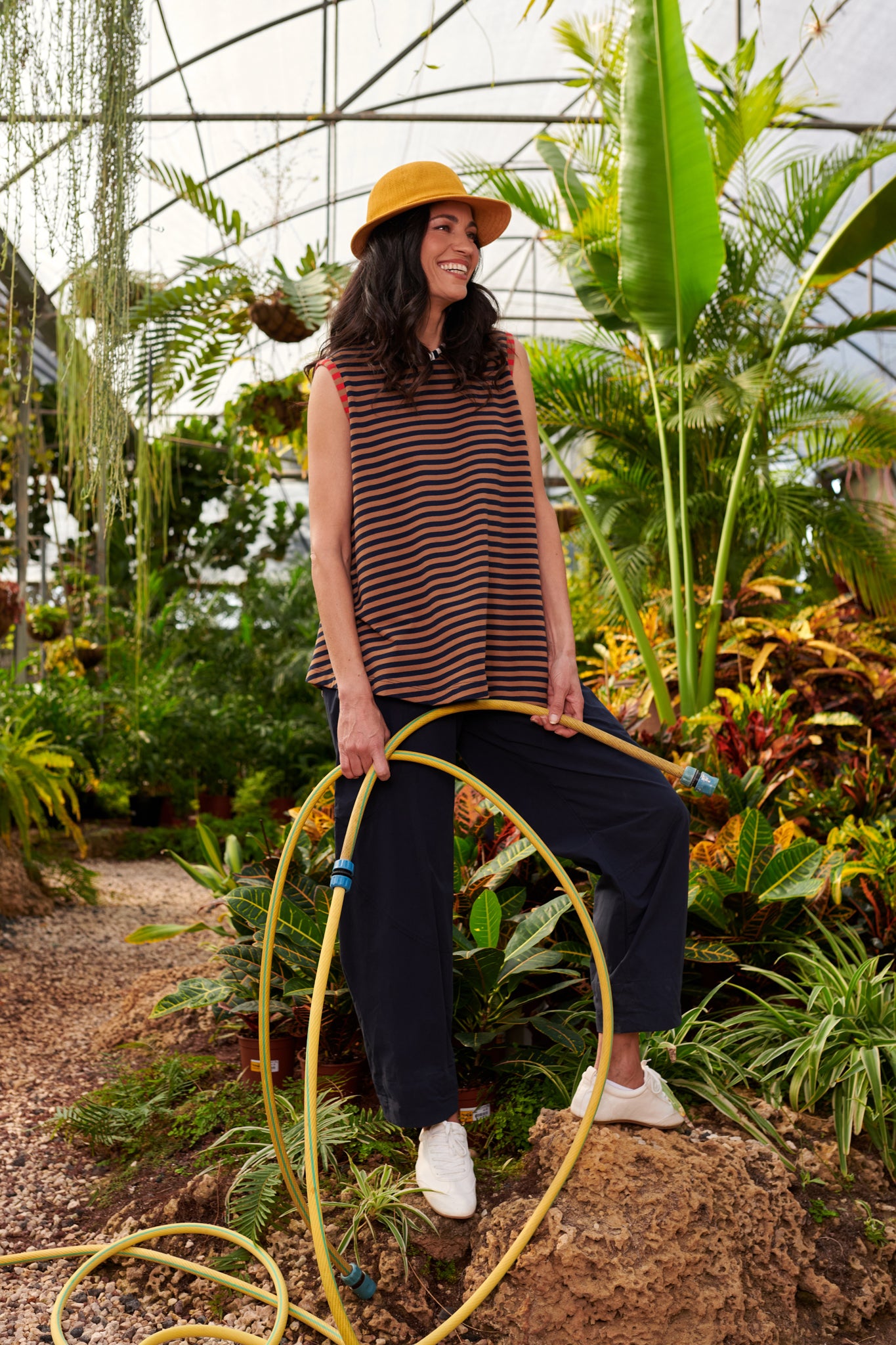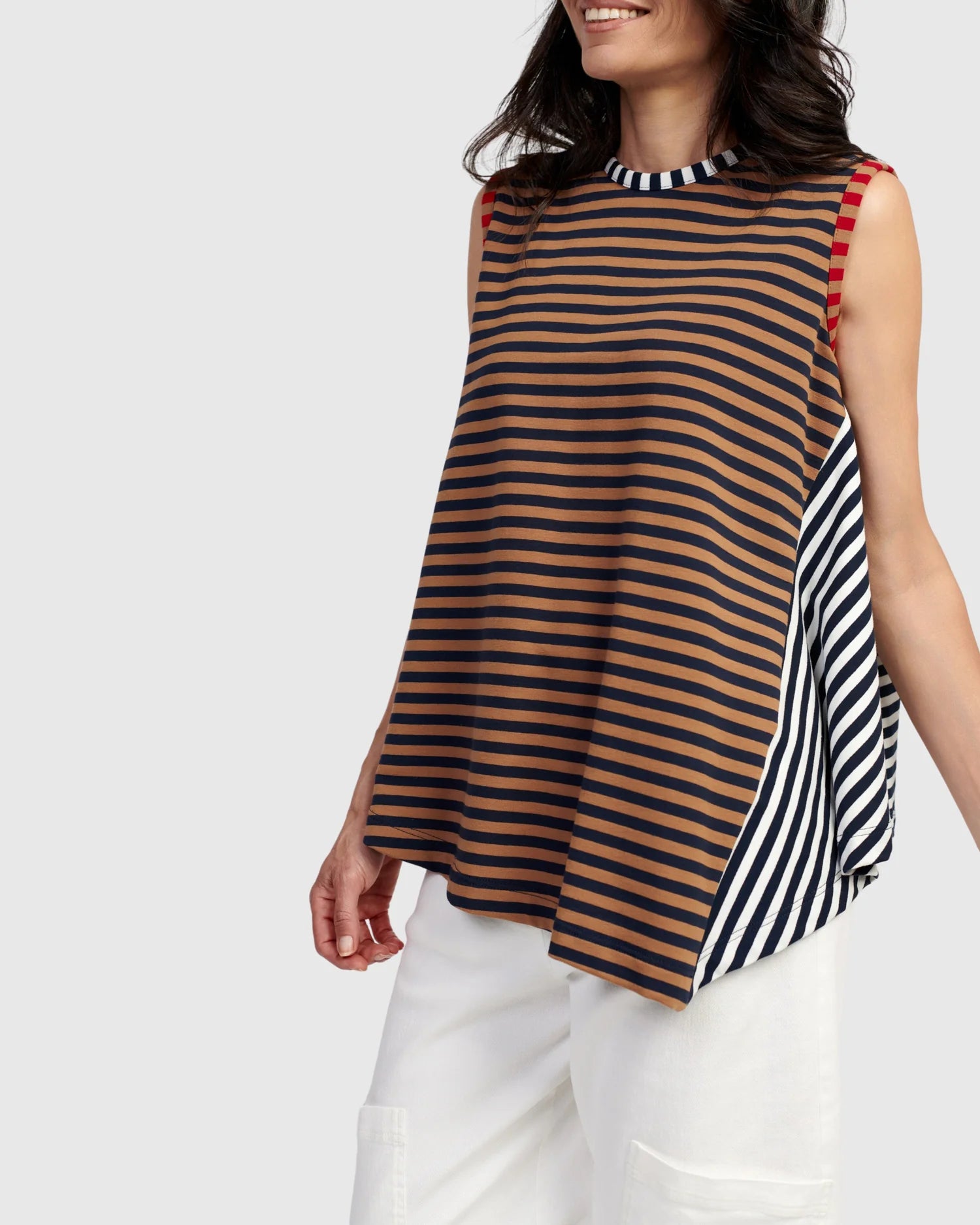 Life's a circus—and so are stripes! Have a bit of fun in this sleeveless pullover top that boasts clean lines and funky stripes in a roomy & swingy A-line silhouette made in a French terry knit. Crew neck, asymmetric hem, oversized fit.