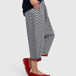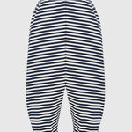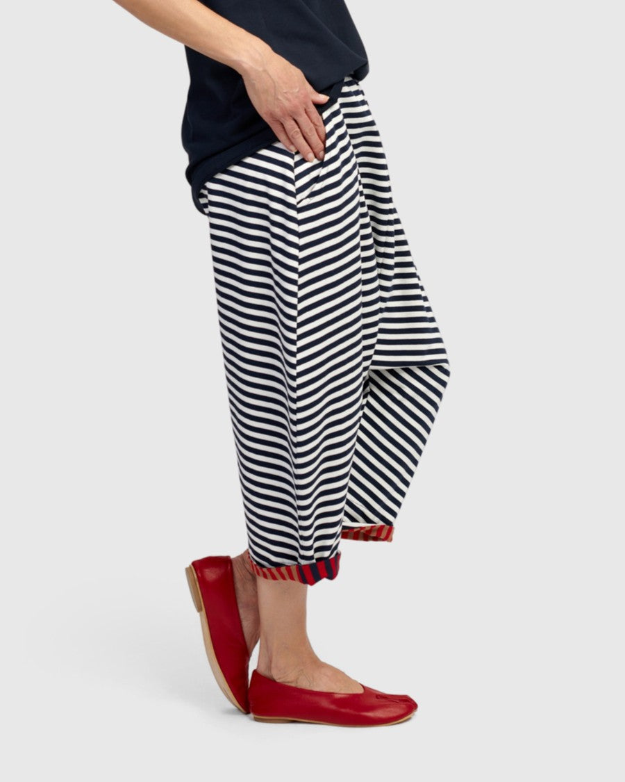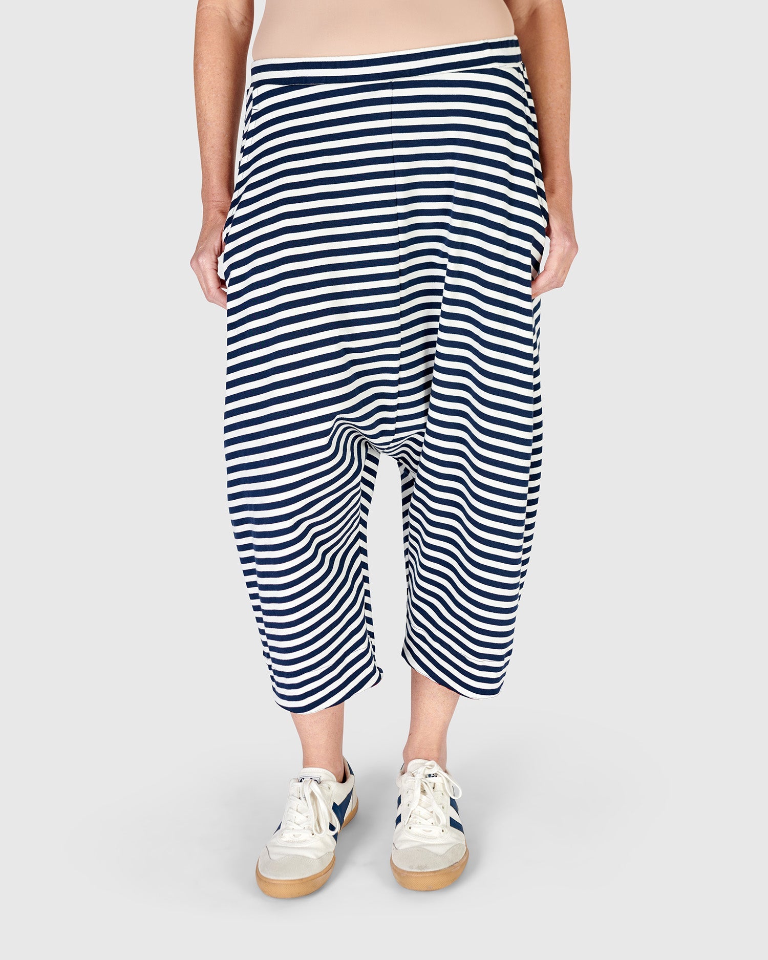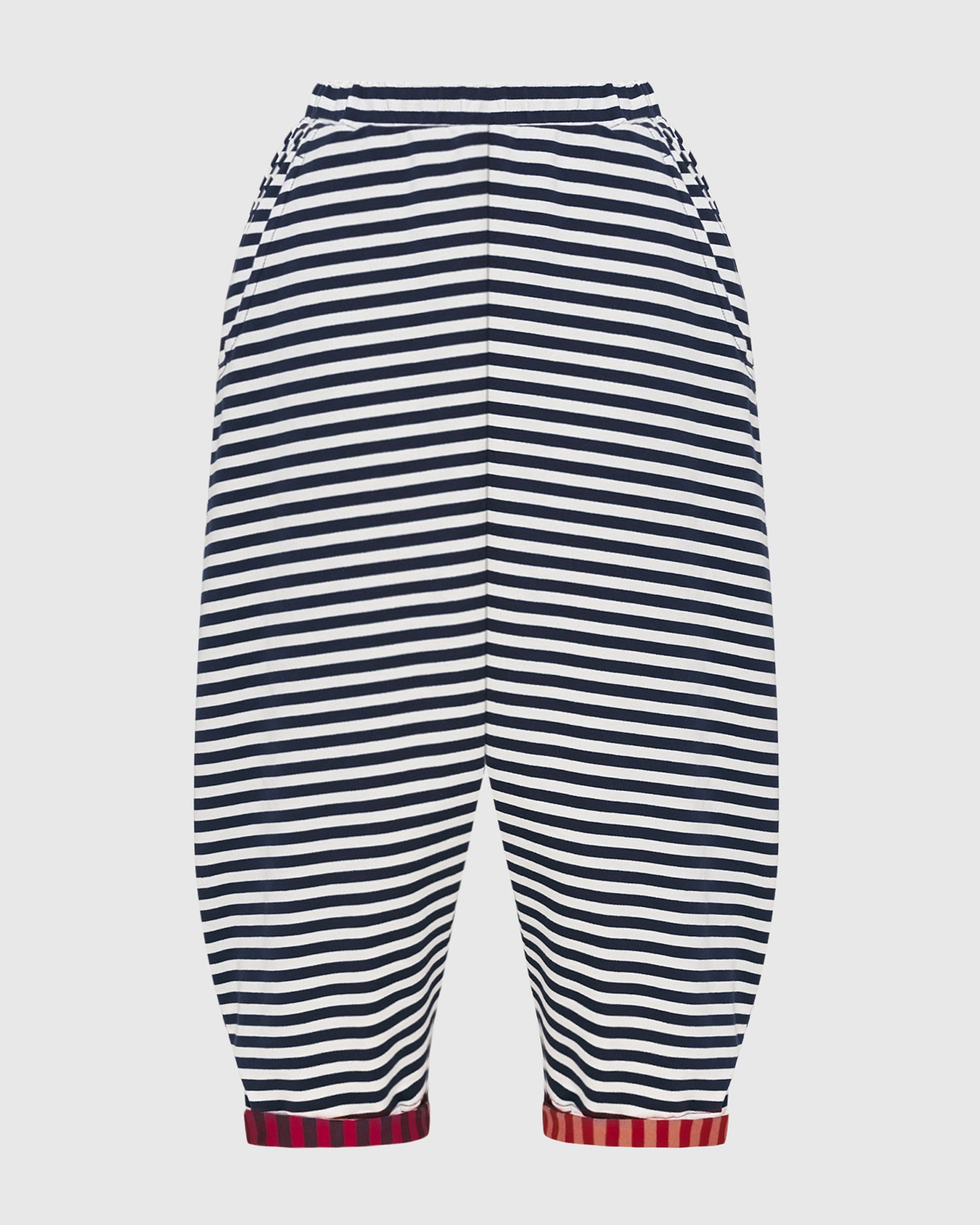Streetwear meets whimsy in these striped harem parents. Details: drop crotch, all-around elastic waist, side pockets, tapered cropped leg. Cuffable hem to show off the inner contrast stripe. Style them high or low waisted to build a ton of fun outfit variations.