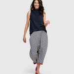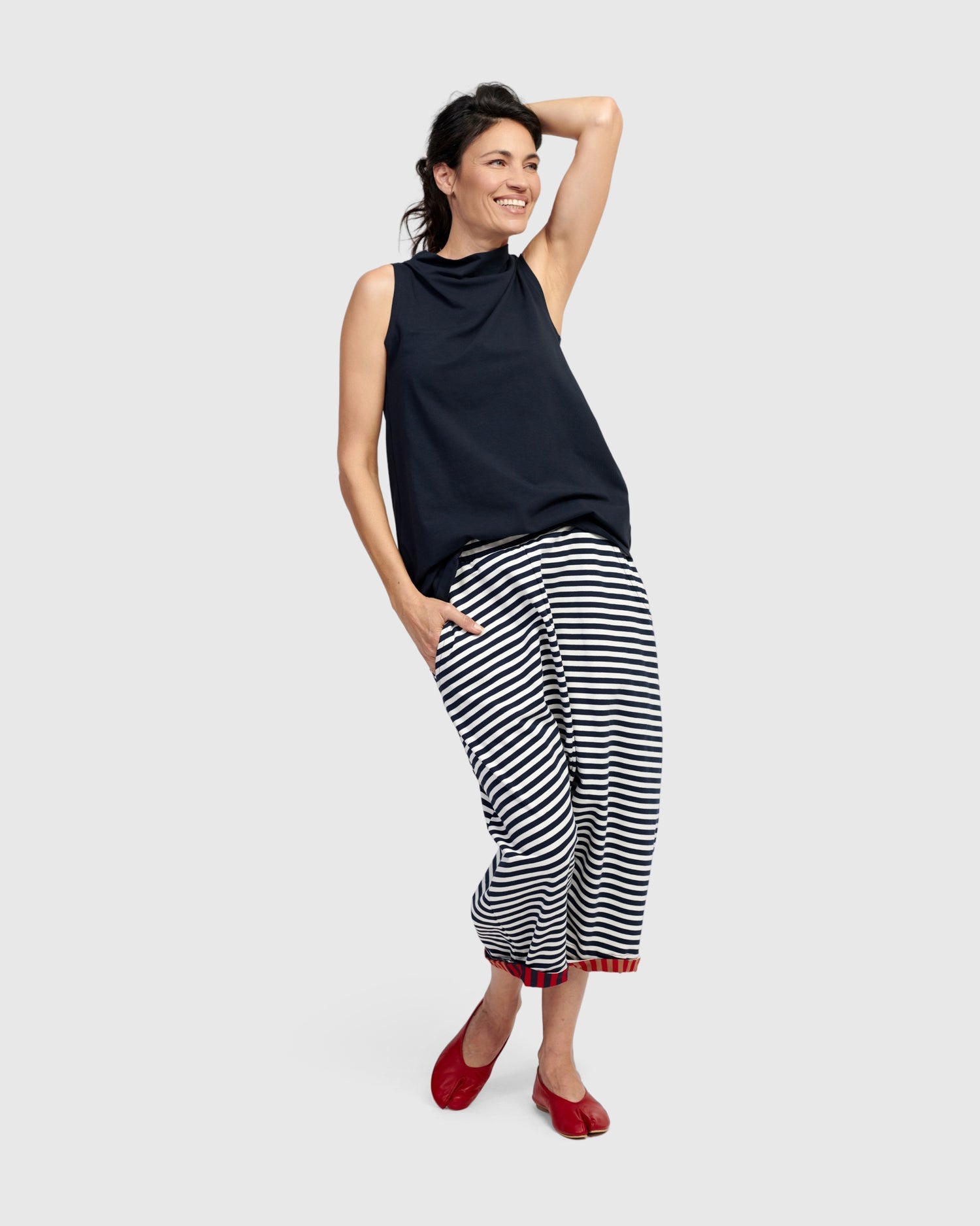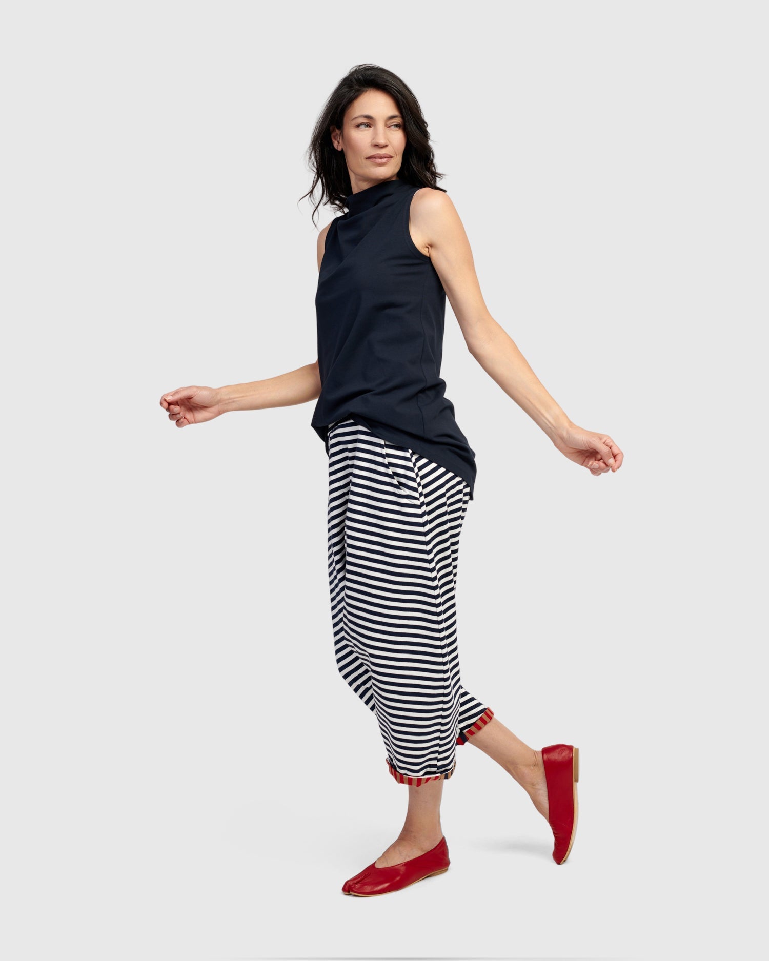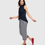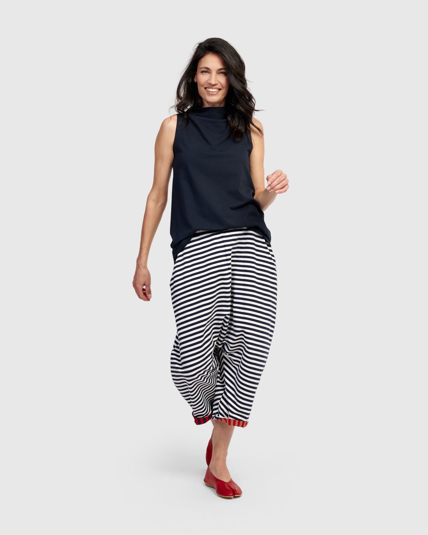 Streetwear meets whimsy in these striped harem parents. Details: drop crotch, all-around elastic waist, side pockets, tapered cropped leg. Cuffable hem to show off the inner contrast stripe. Style them high or low waisted to build a ton of fun outfit variations.