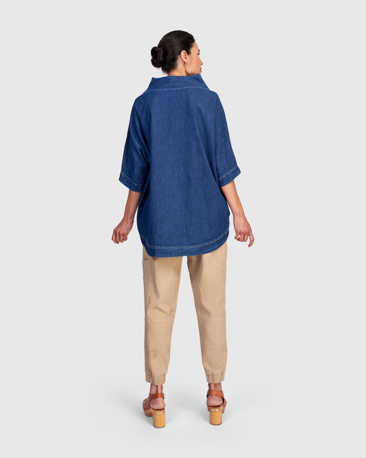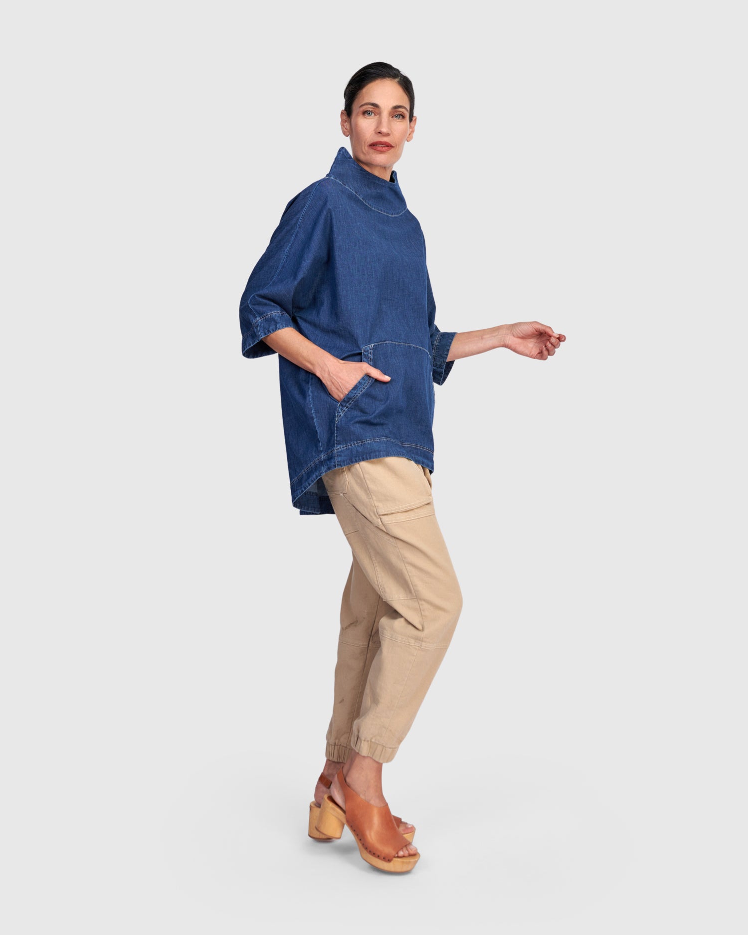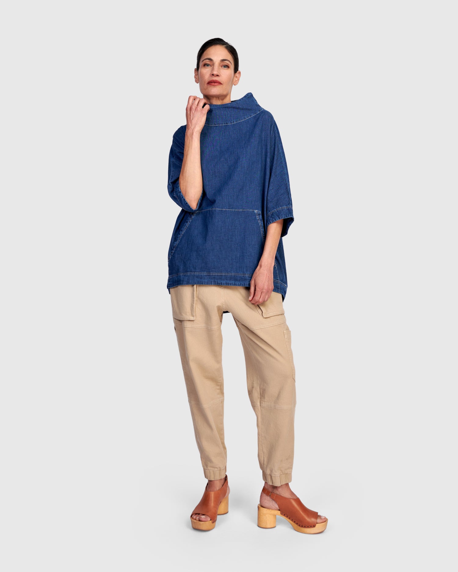 Soft denim takes on an easy, sculptural shape in this relaxed top, finished with a generous front pocket and softly structured funnel neckline. The Denim on Denim Top is designed for effortless layering with quiet character.