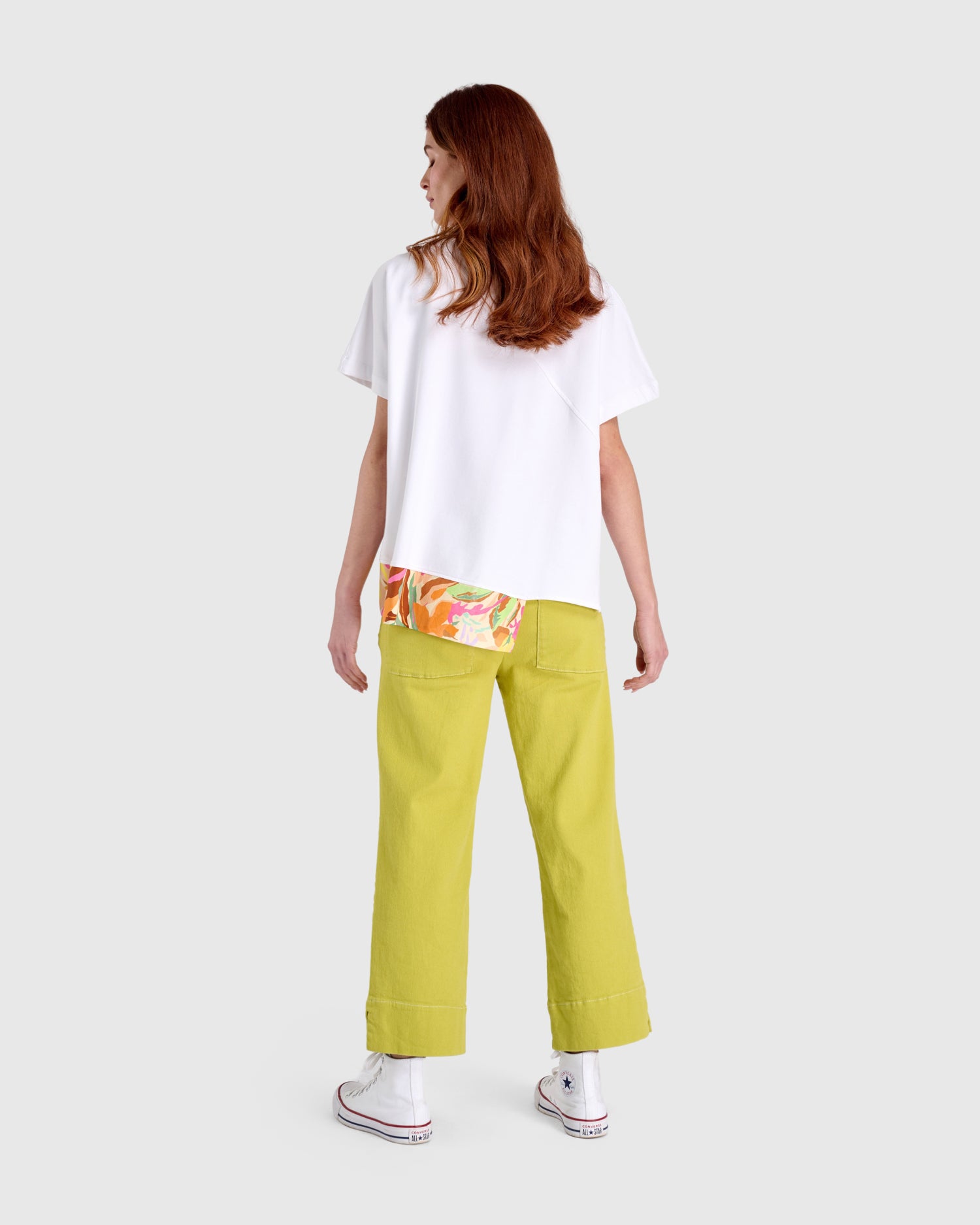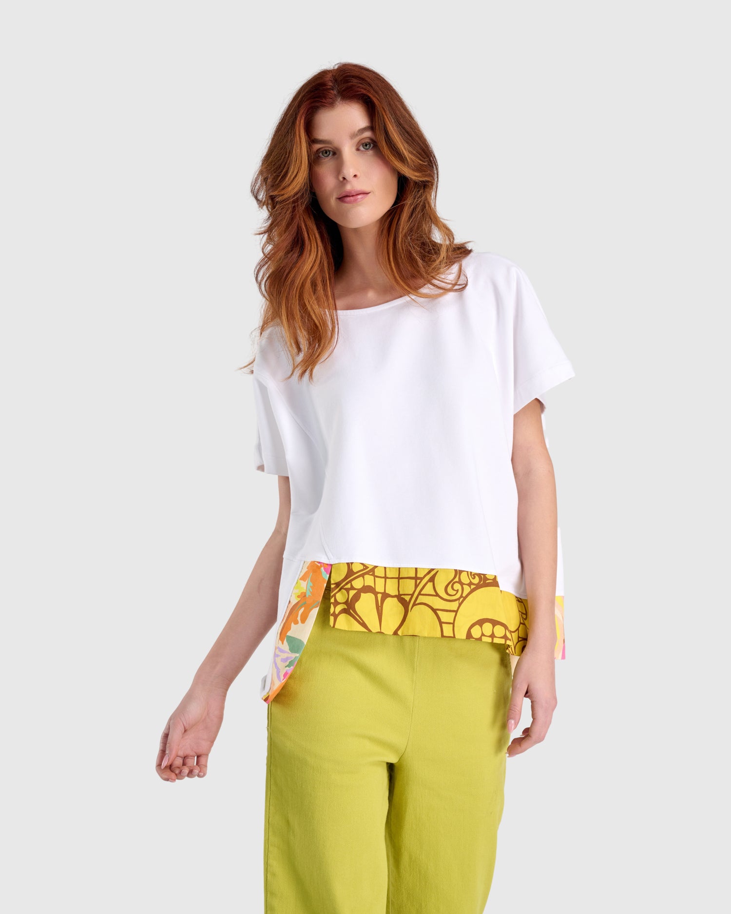Clean white simplicity meets an unexpected burst of print in the Mixed Media Tee. Designed with an easy silhouette and layered contrast hem, it brings playful detail to an otherwise understated piece. Pairs well with the Market Trousers.