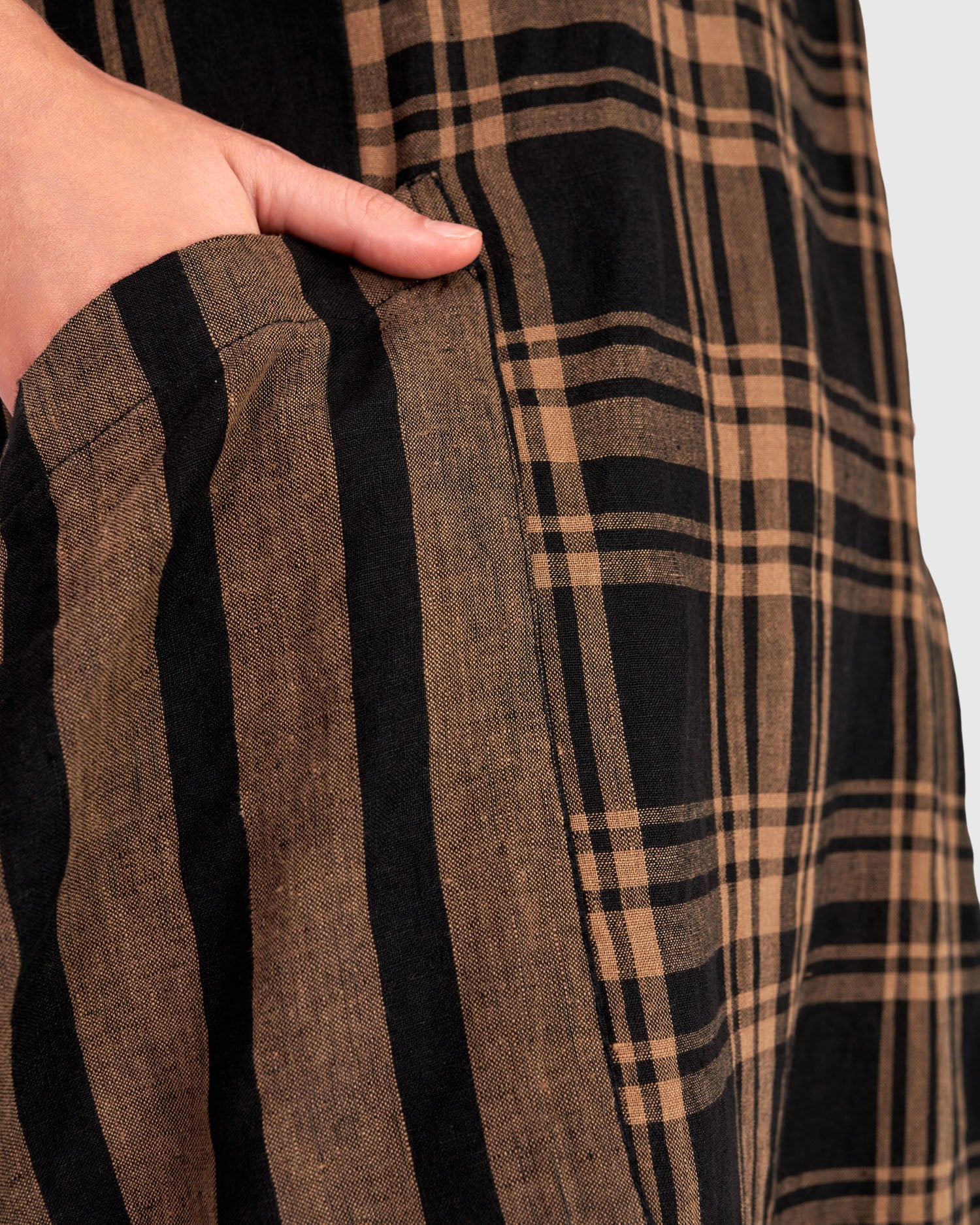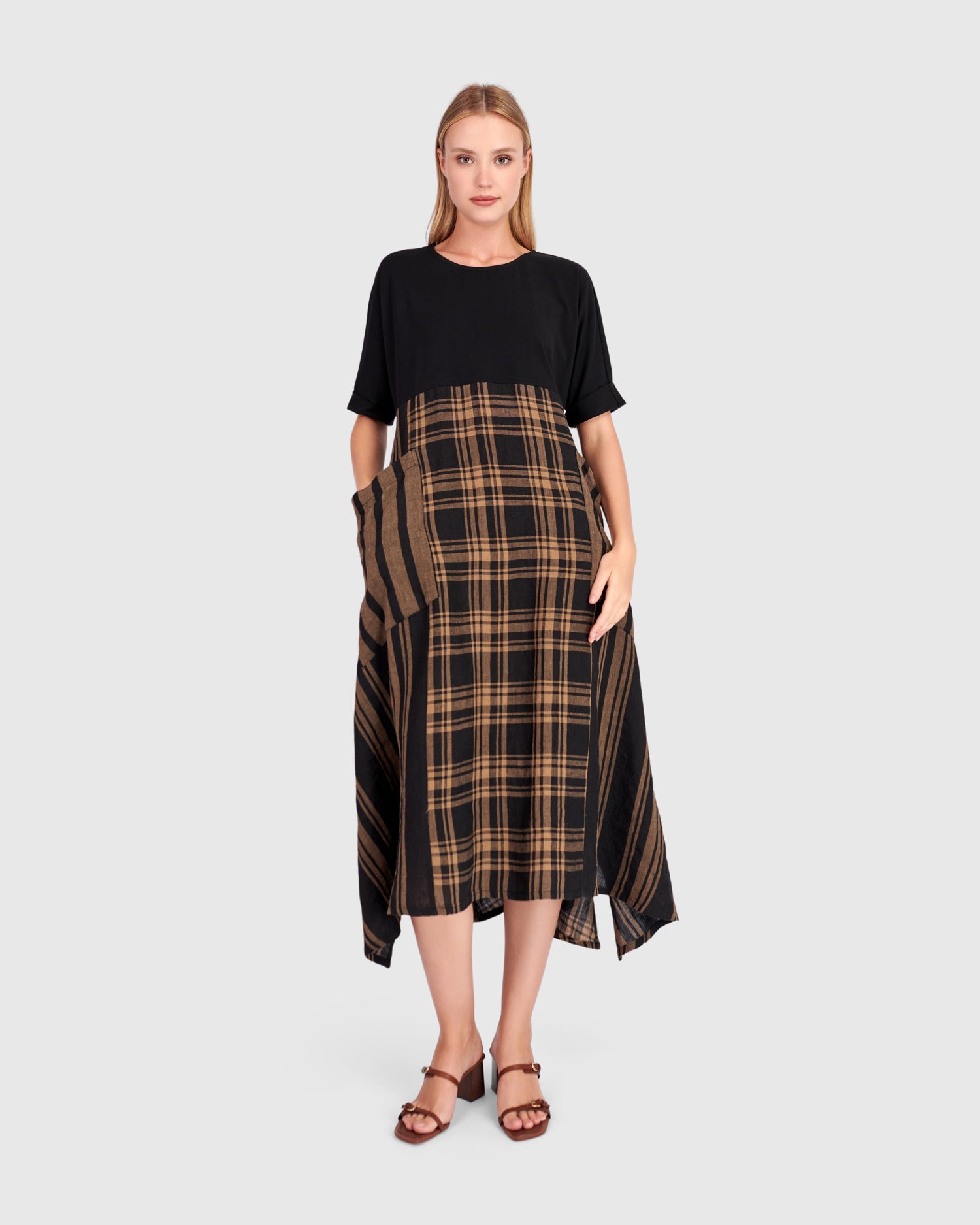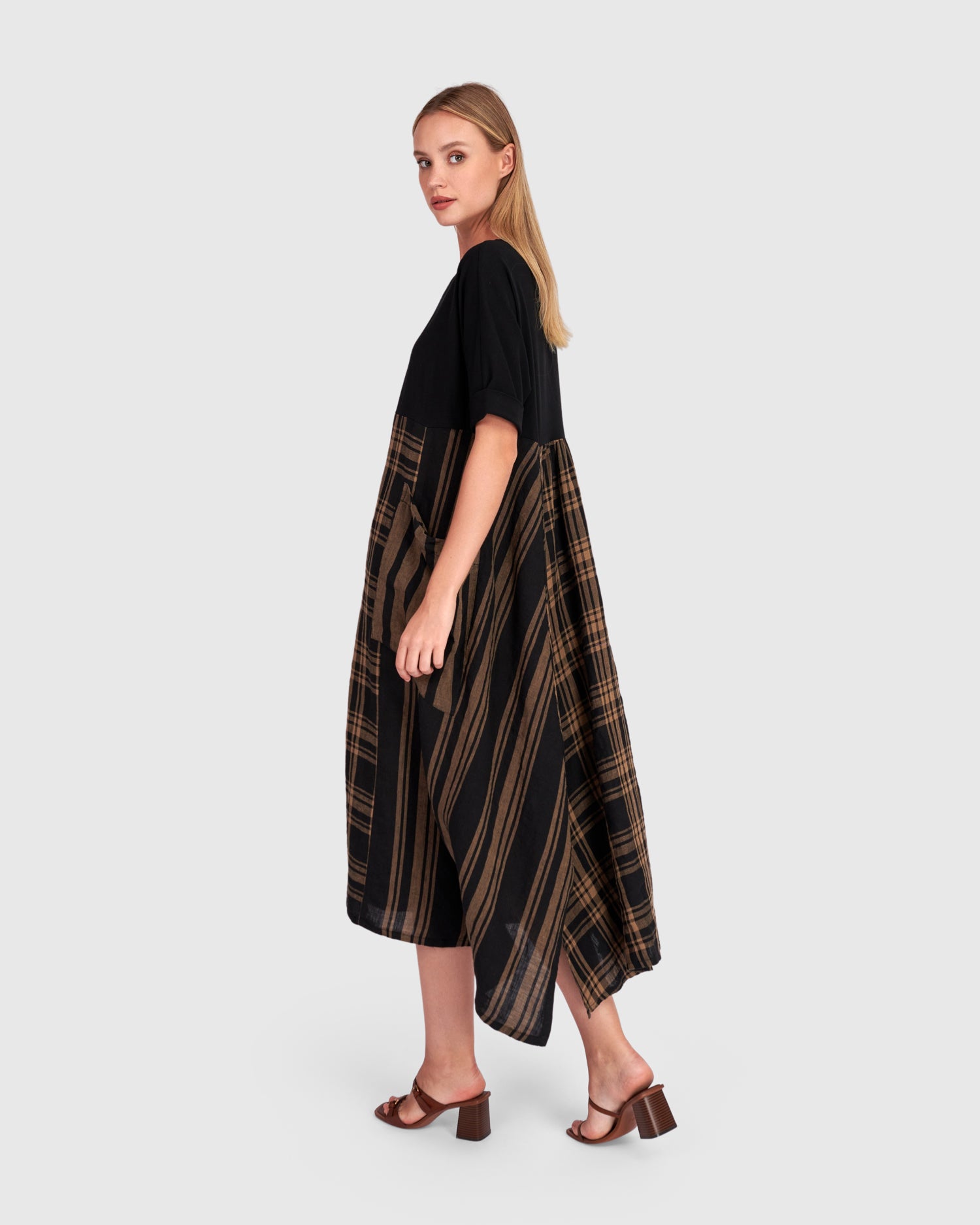 A striking mix of plaid and stripe panels gives the Terra Dress its quiet drama. Finished with an oversized pocket and flowing asymmetric hem, it is designed for ease with unmistakable character.