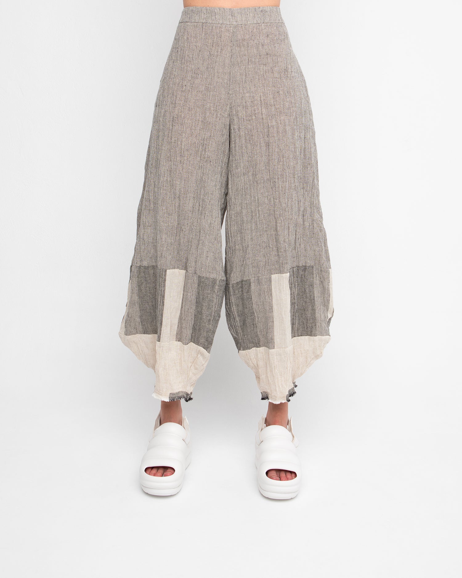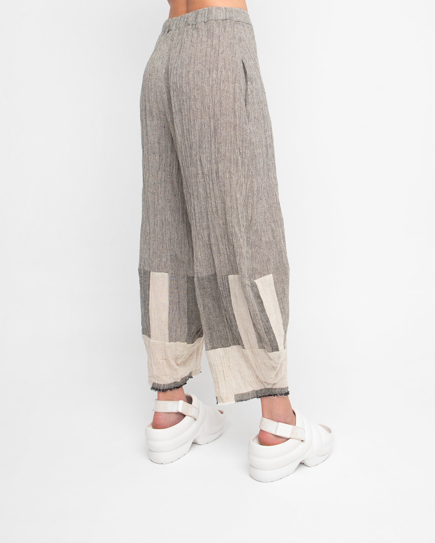 The OZAI Stripe Trousers redefine laid-back sophistication with their effortless wide-leg silhouette and artful patchwork design. Crafted from breathable, textured fabric, these cropped trousers feature a soft elastic waist for ultimate comfort. The contrasting stripe details add visual intrigue, making them the perfect statement piece for an elevated casual look. Pair with a simple top or structured blazer for a versatile style moment.