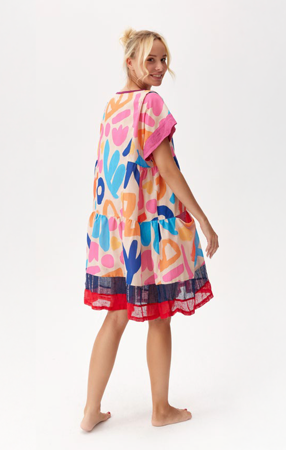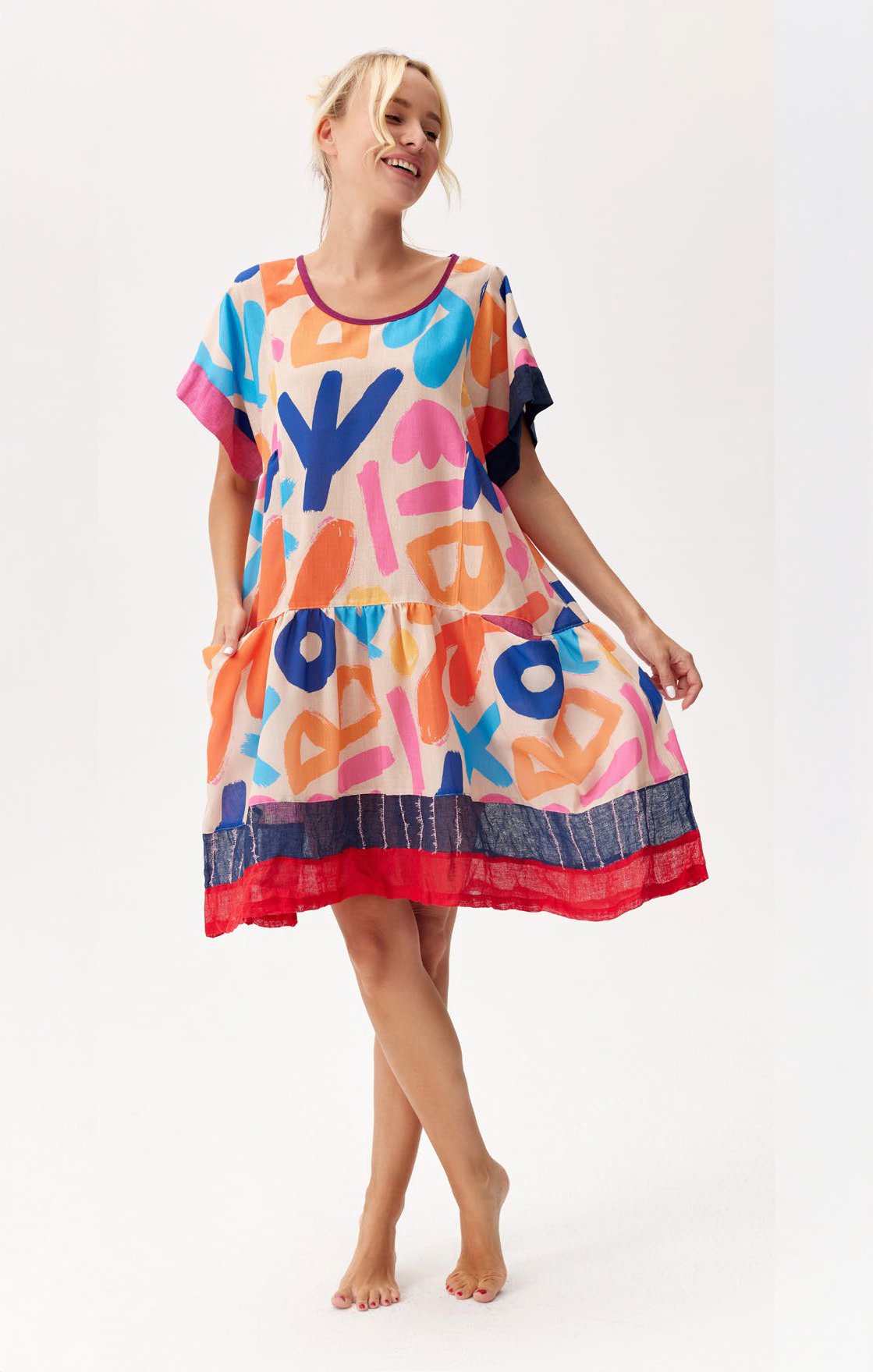 The all-over abstract print brings a playful energy in bold strokes of colour, balanced by a contrast meshed hem in red and navy.