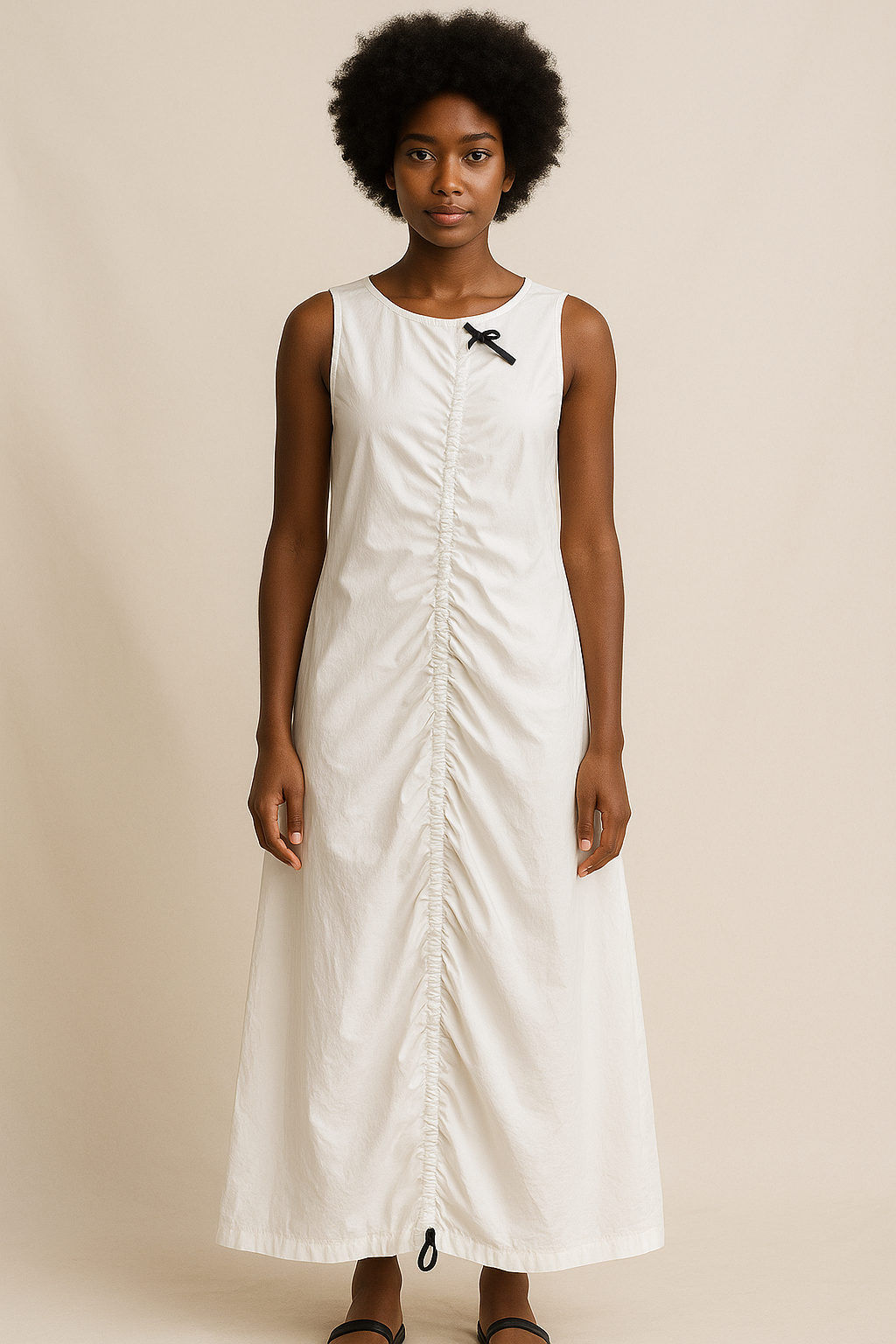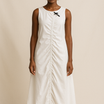 The Ruched Column Cotton Dress is crafted from 100% cotton in a clean, sleeveless silhouette. A central ruched panel runs from neckline to hem, created by an adjustable drawcord that allows you to tailor the shape and drape. Minimalist yet architectural, the Ruched Column Cotton Dress captures modern ease through thoughtful construction and subtle texture.