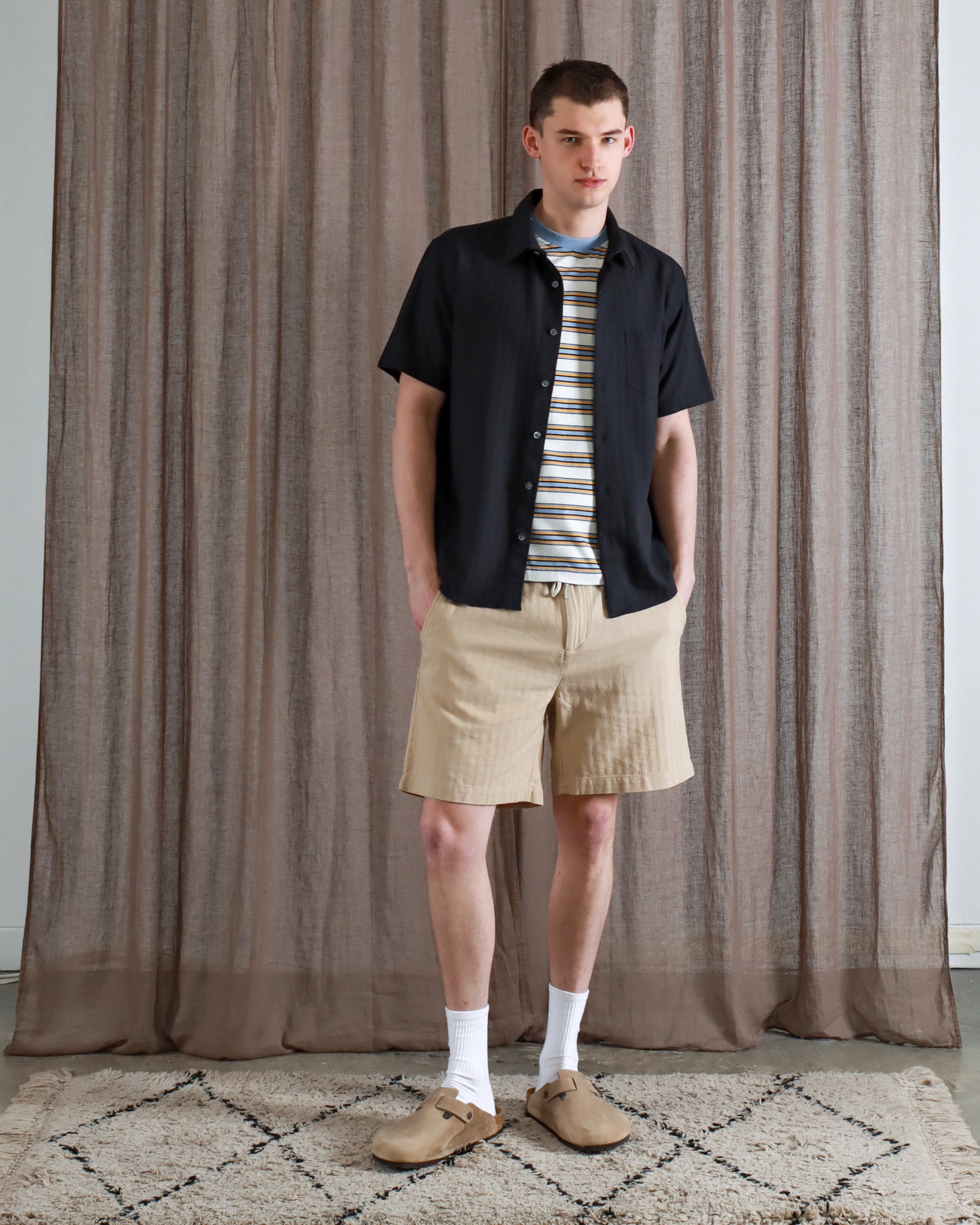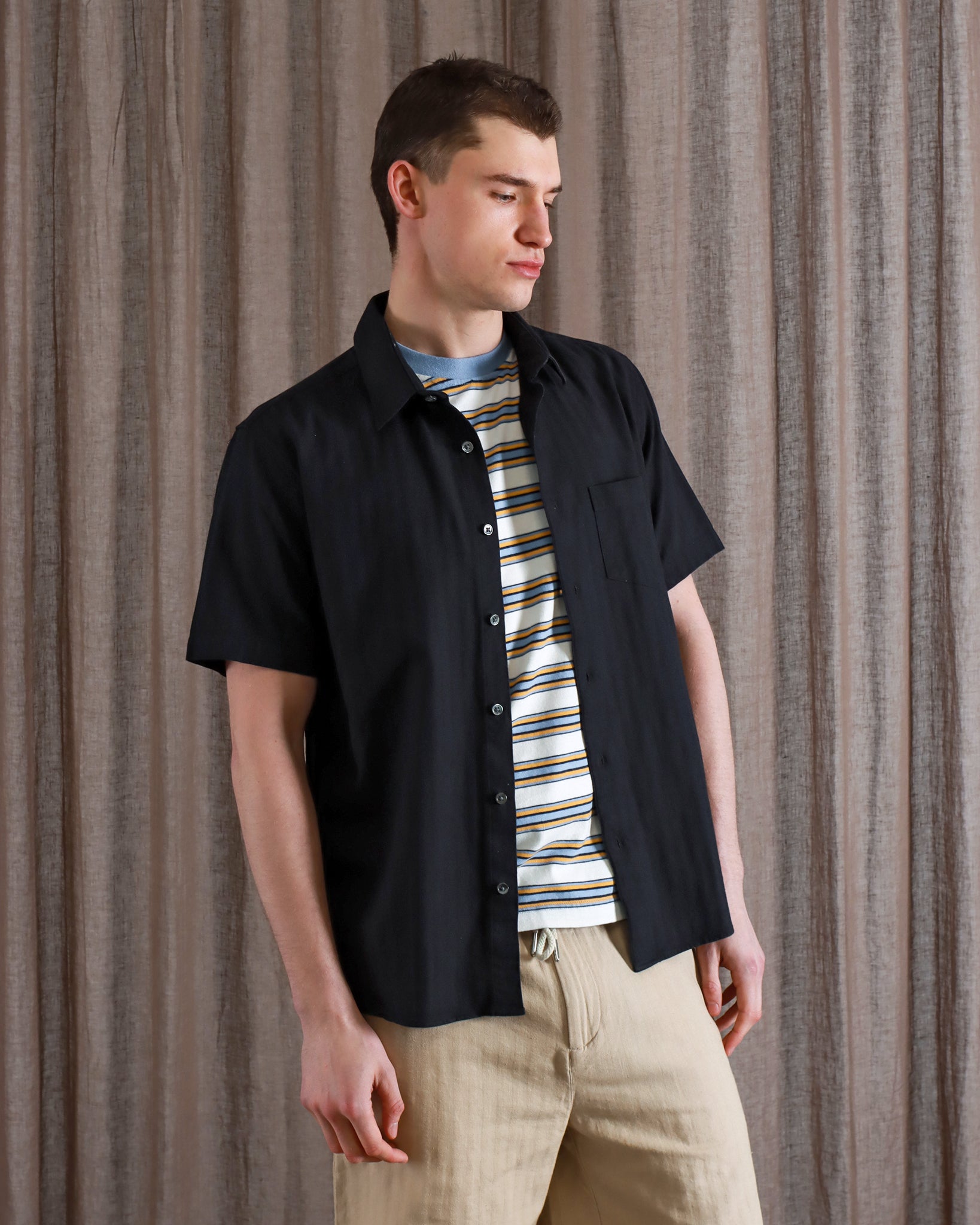 Expertly crafted in a herringbone twill with subtle vertical stripe detail, this classic short sleeve shirt is made of a soft and sustainable combo of BCI cotton and hemp. The Classic Herringbone Twill S/S Shirt features an angled left-breast pocket, french front, mother of pearl buttons, and locker loop.