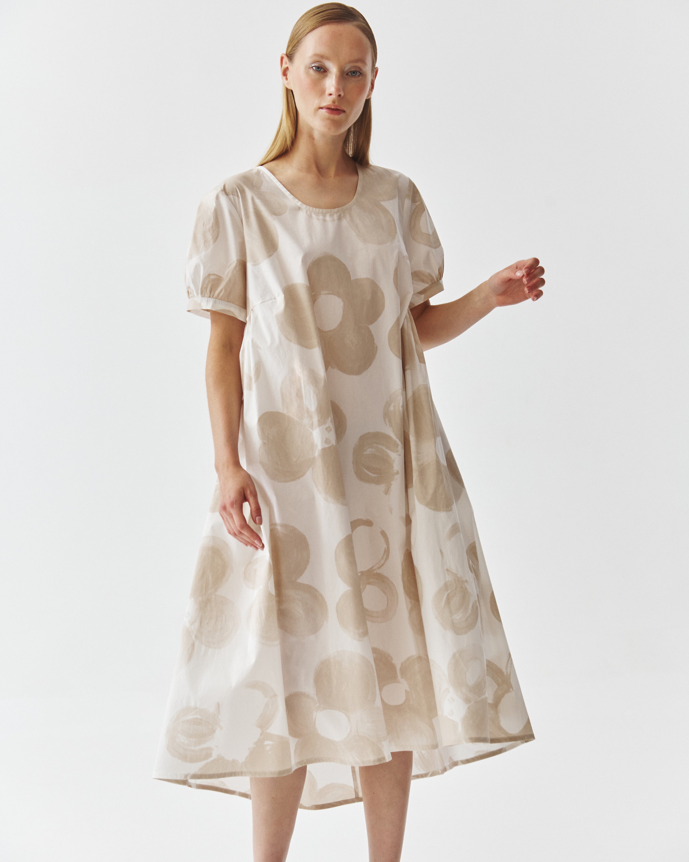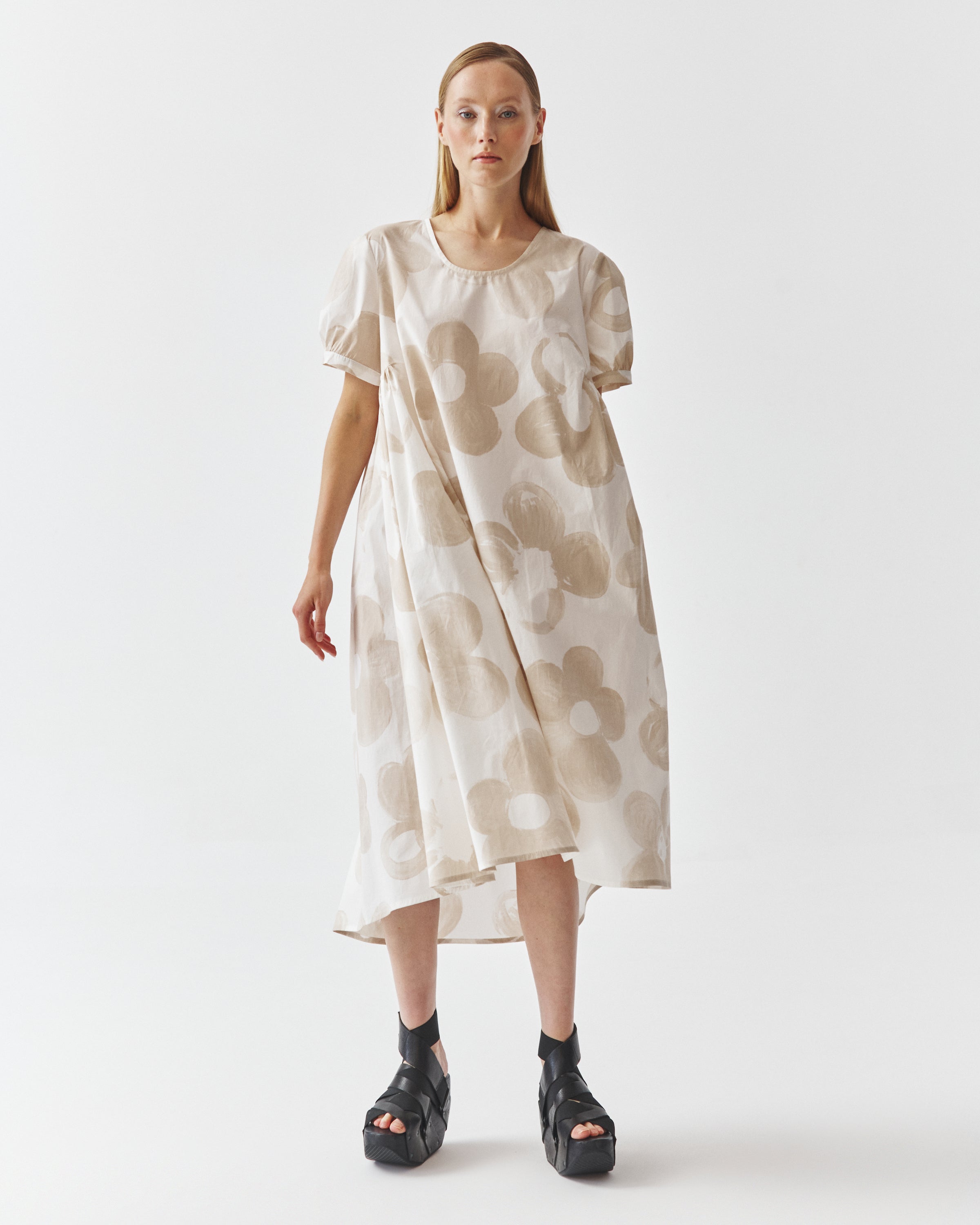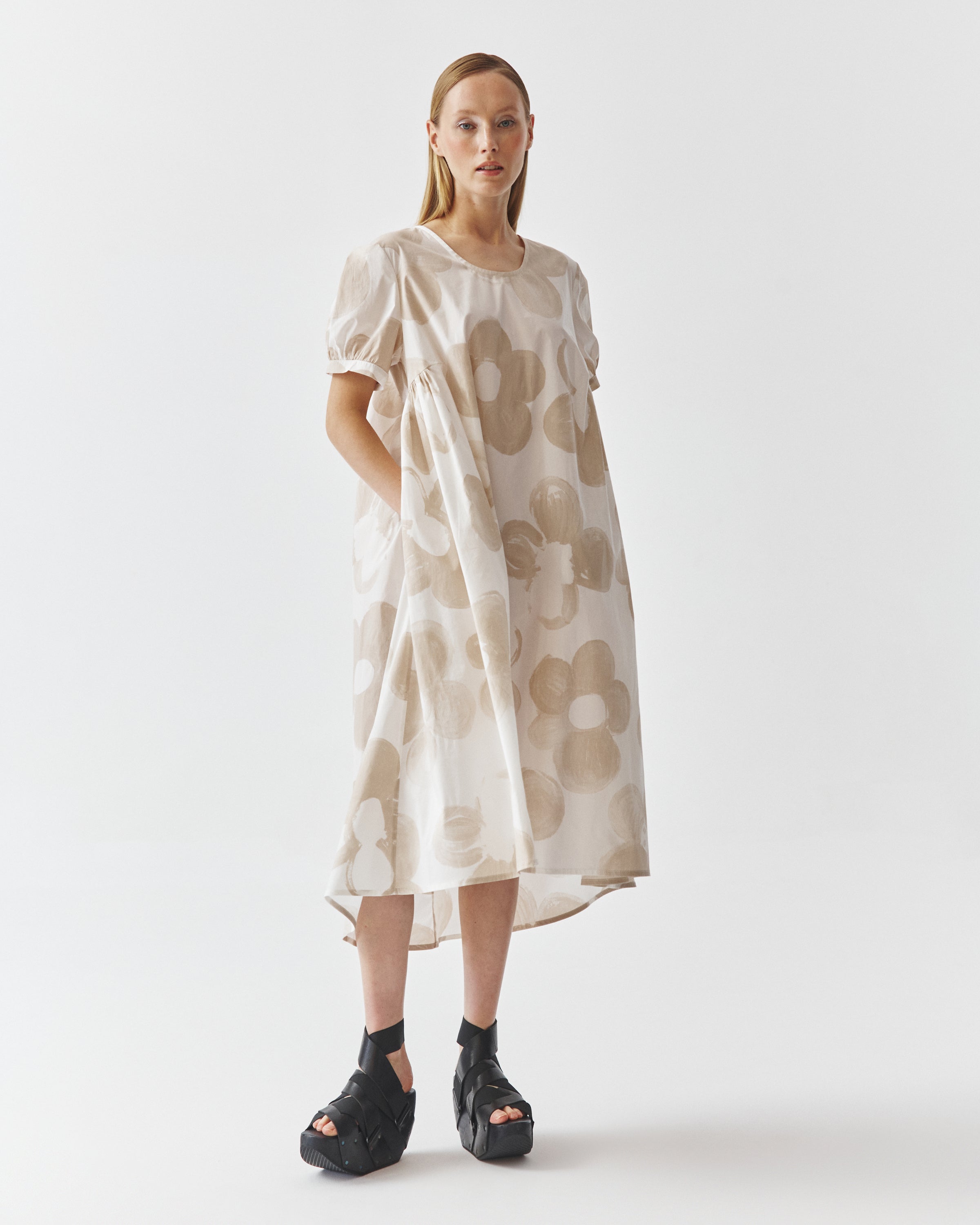 A touch of whimsy, grounded in polish. The Bloom Dress - is a voluminous dress in a light floral wash and has a gentle high-low hemline and gathered sleeves. Airy and weightless, it’s an abstract nod to nature’s soft geometry.