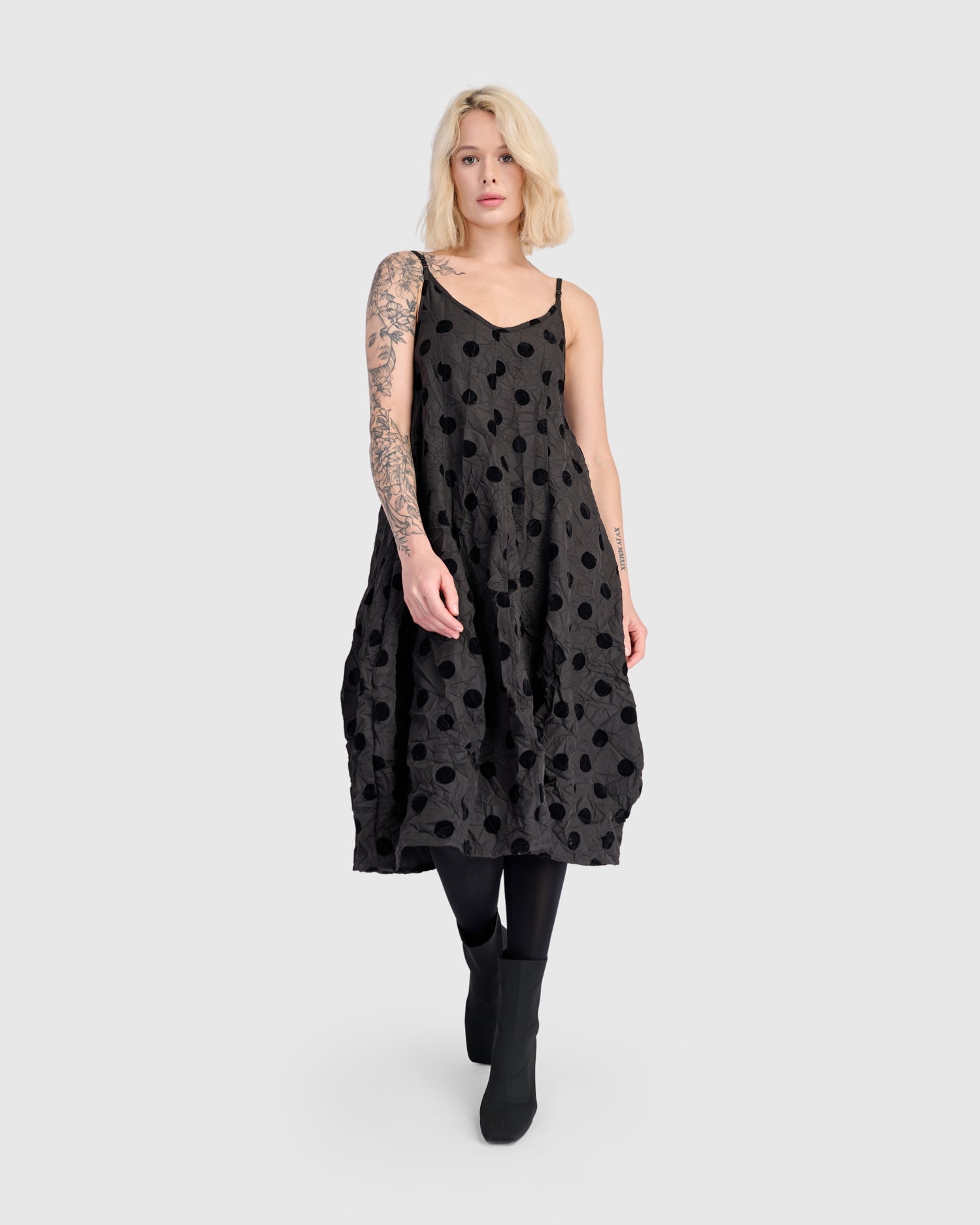 The Reve Tank Cocoon Dress is an updated take on the signature cocoon shape, this midi dress floats on the body in airy taffeta scattered with velvet dots. The v-neckline softens the front while adjustable straps allow for a customisable fit.