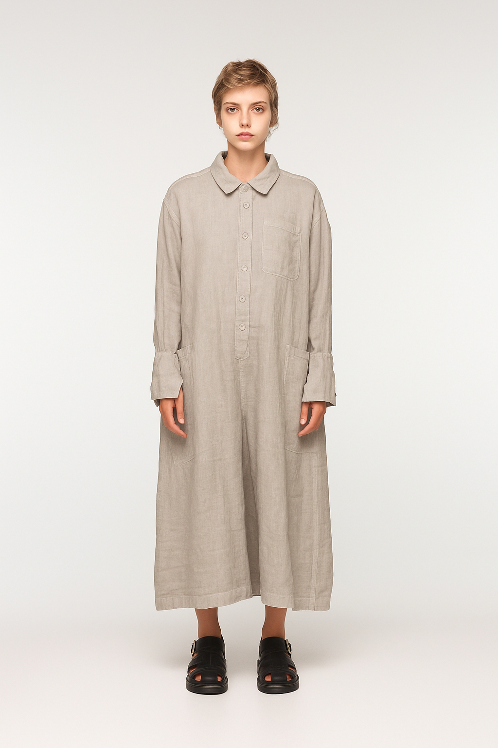 The epitome of slouchy sophistication. BEBER is a generously cut, long-sleeved jumpsuit crafted in a featherlight ramie, soft to the touch and deliciously breathable. Designed with a laid-back collar, button fastening, and an artfully oversized silhouette, it features three pockets at the front and one dramatically placed at the back—because function should never be boring.