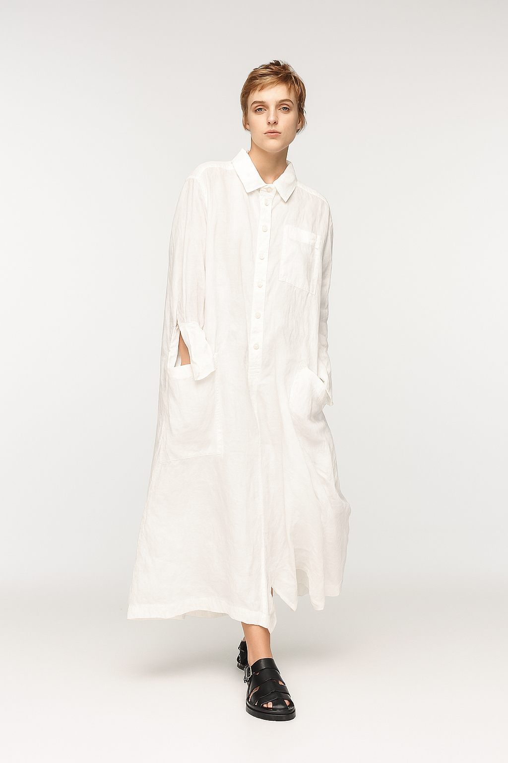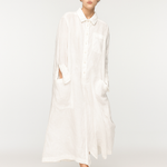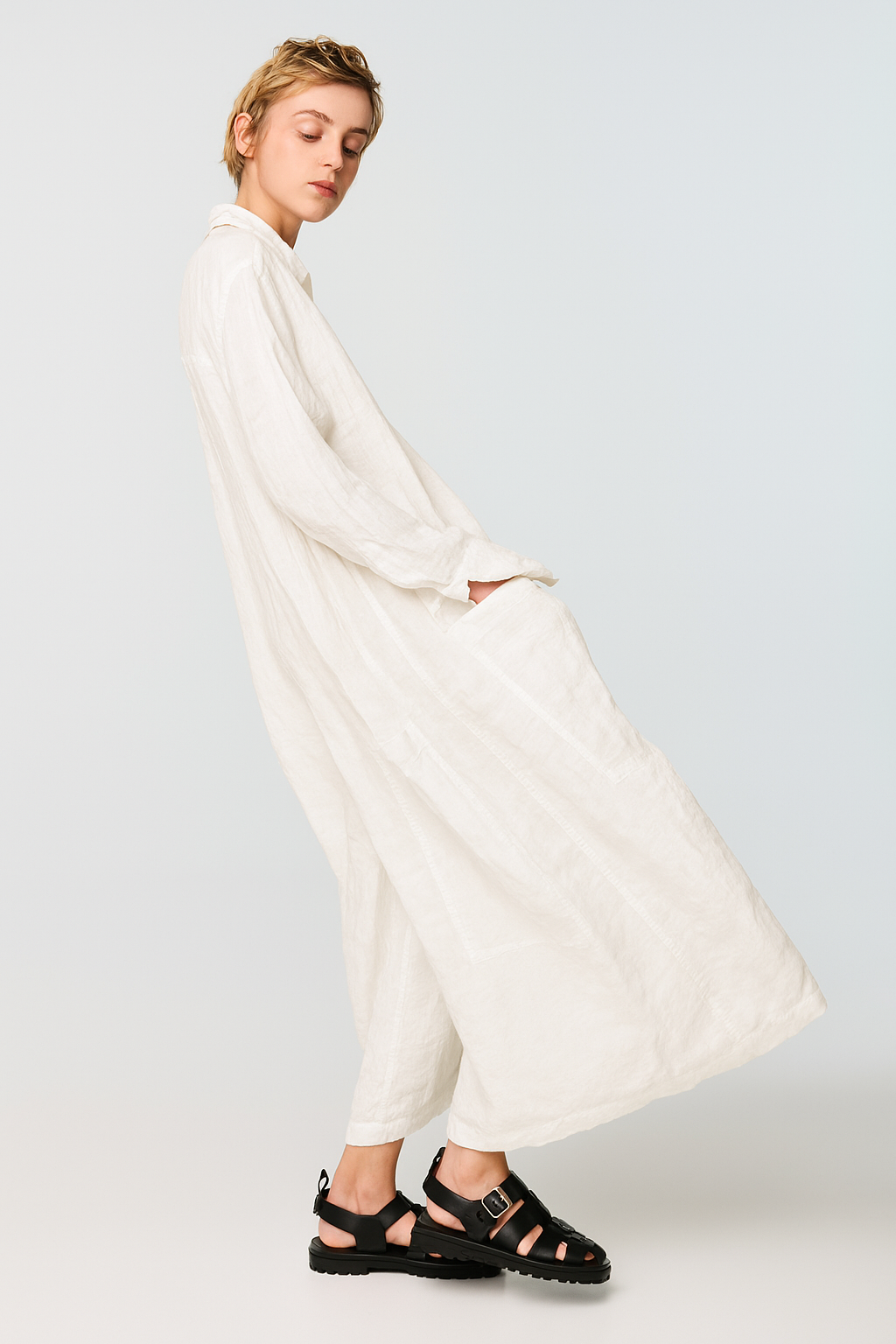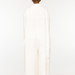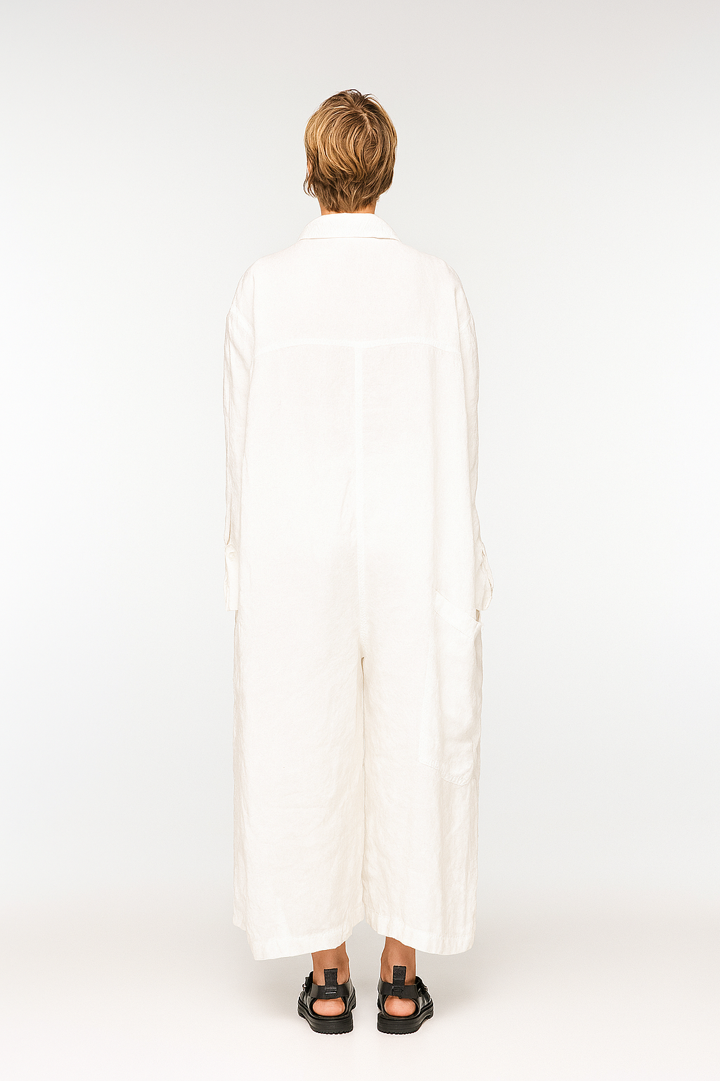 The epitome of slouchy sophistication. BEBER is a generously cut, long-sleeved jumpsuit crafted in a featherlight ramie, soft to the touch and deliciously breathable. Designed with a laid-back collar, button fastening, and an artfully oversized silhouette, it features three pockets at the front and one dramatically placed at the back—because function should never be boring.