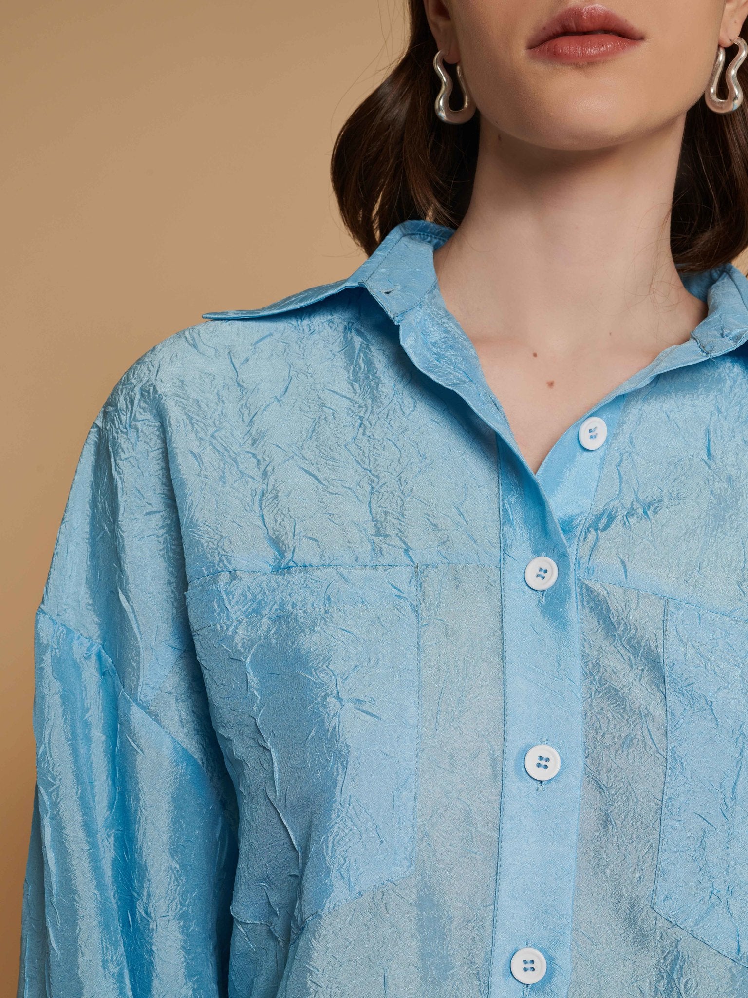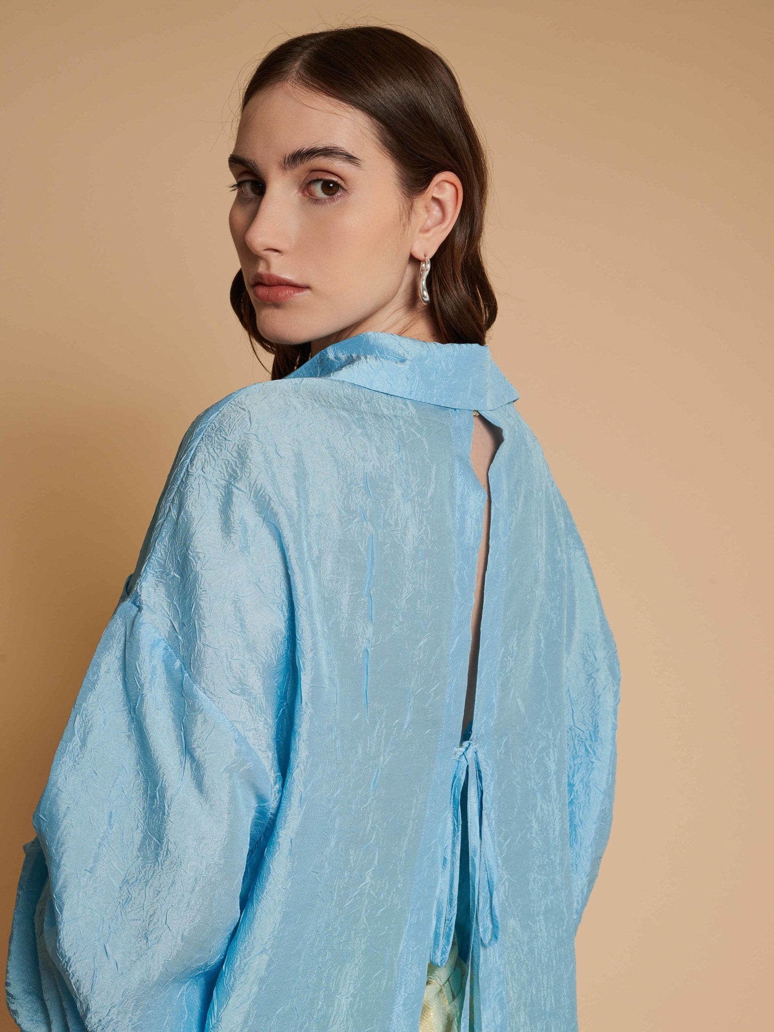 Chemise en tissu effet froissé. Une coupe surdimensionnée avec un dos ouvert avec un lien réglable. Fini avec une fermeture boutonnée contrastée.