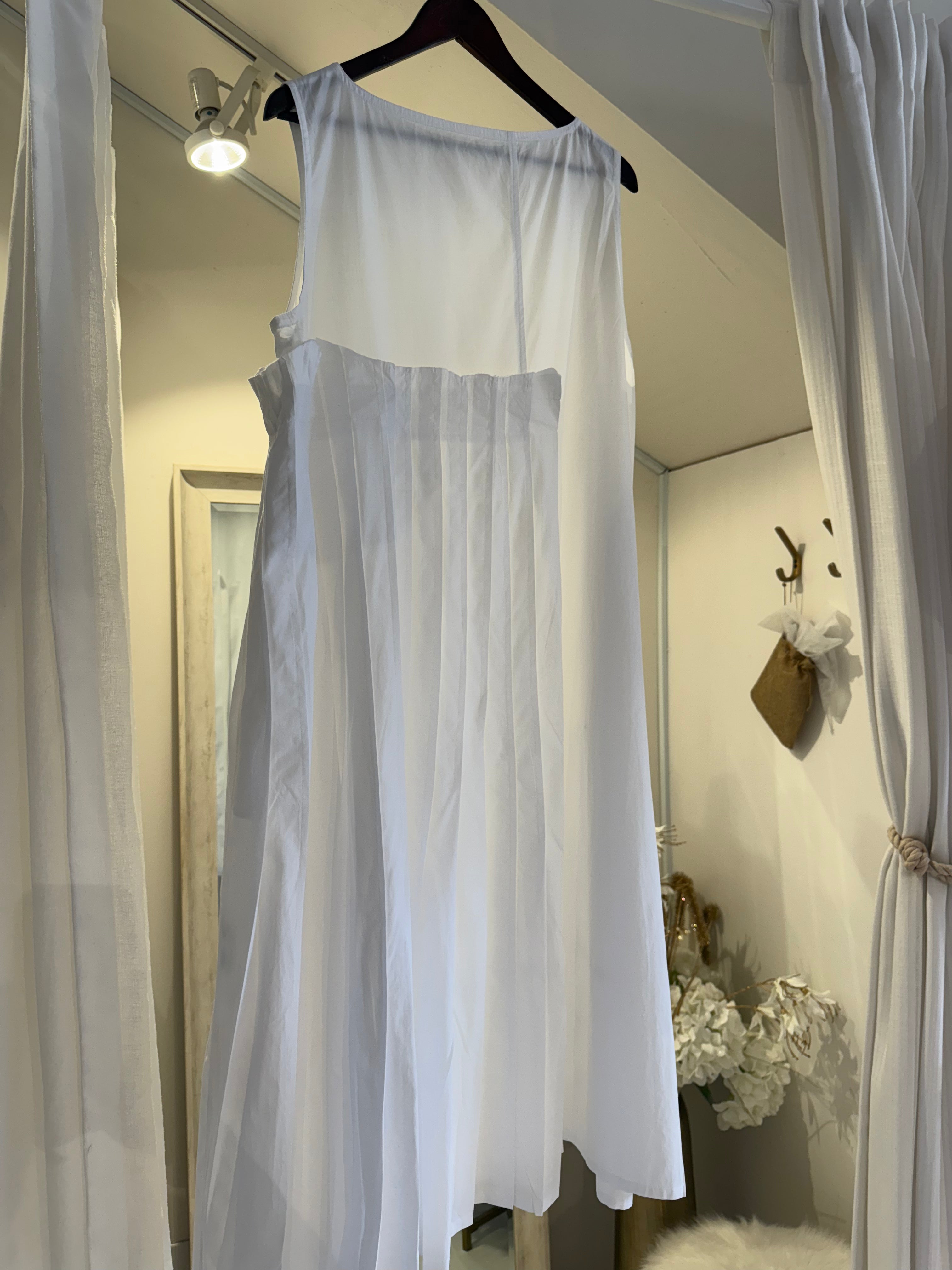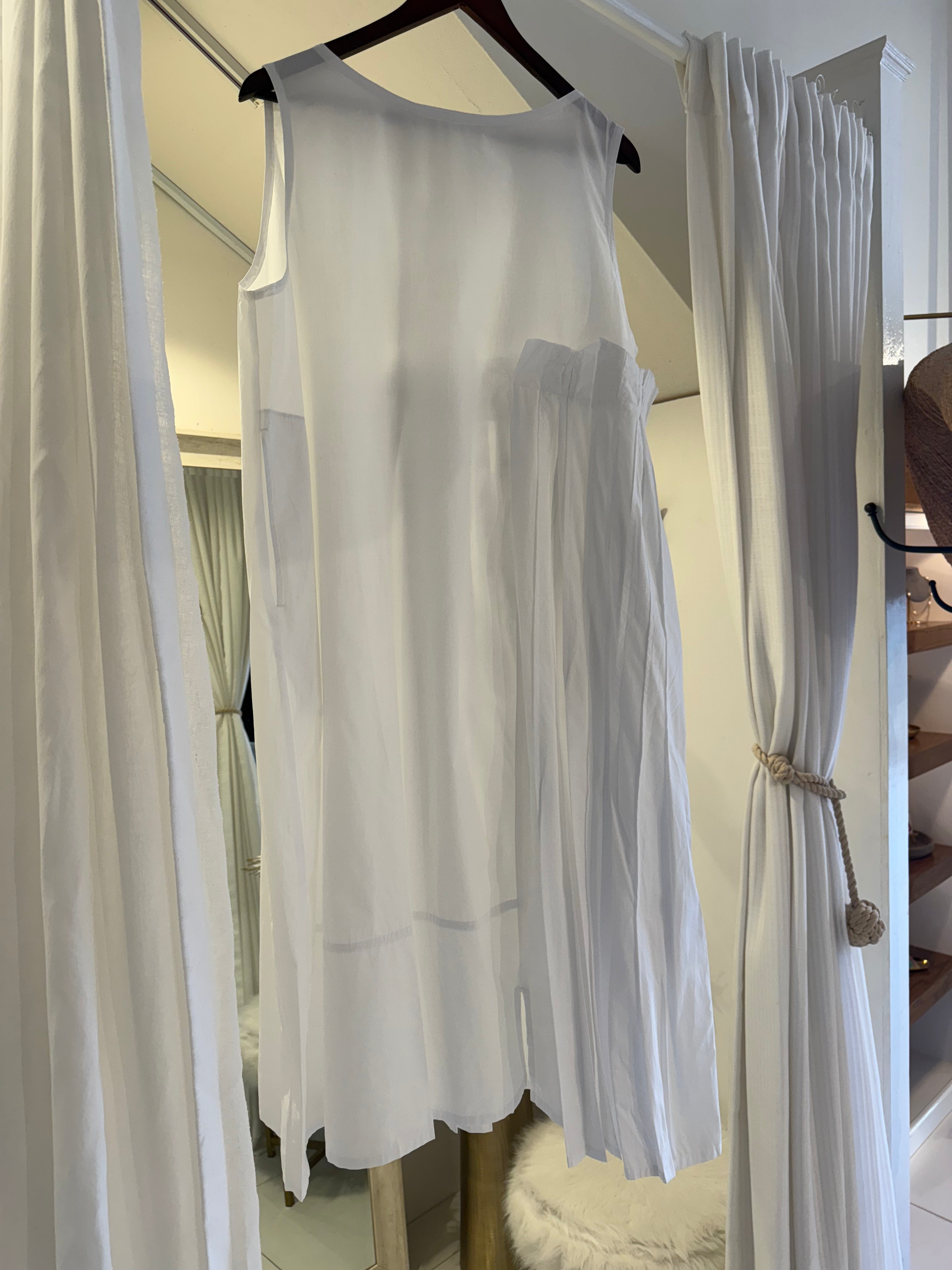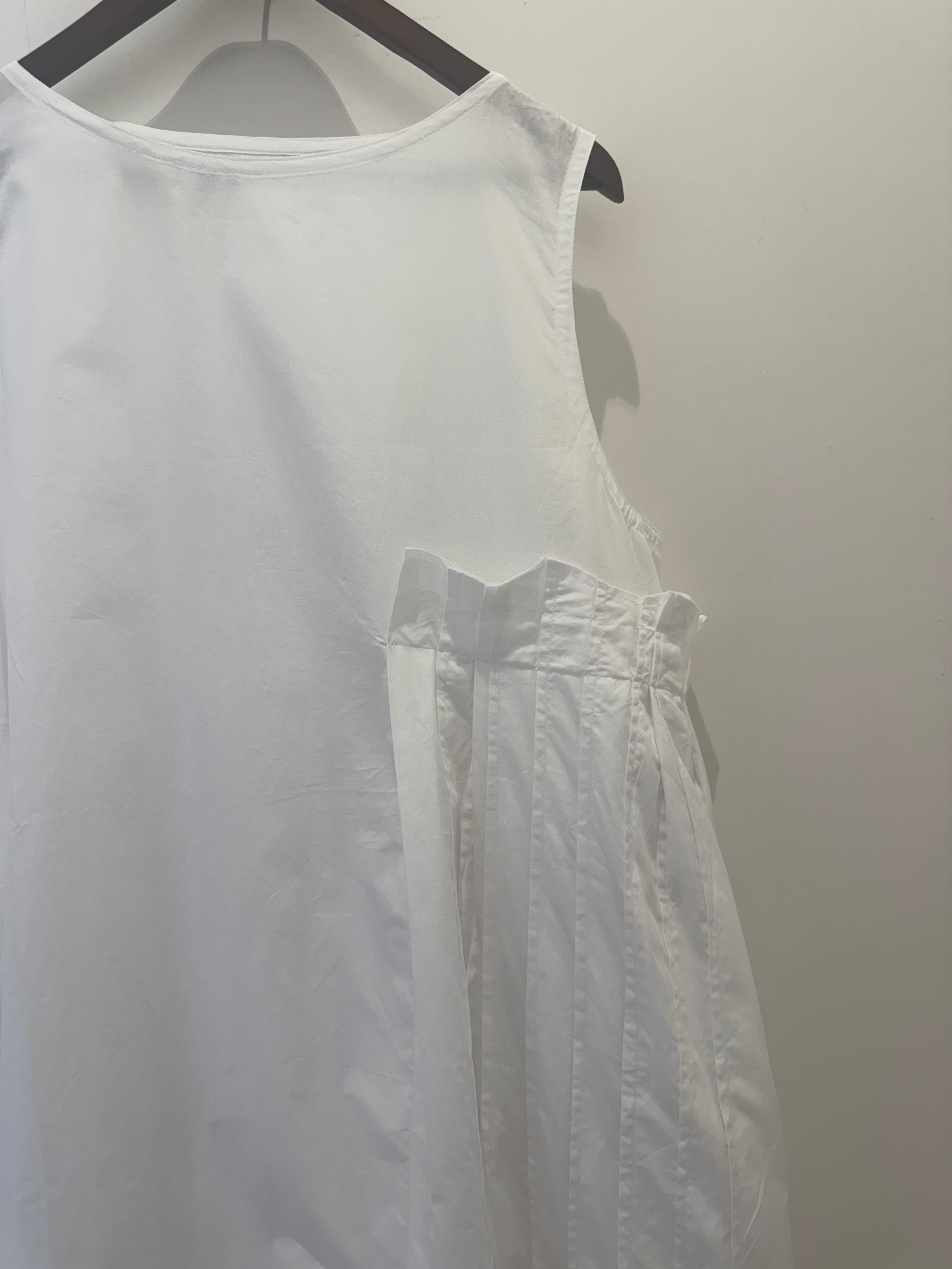 The Asymmetric Pleat Cotton Dress by Moyuru is crafted in Japan from 100% soft cotton. Designed with the brand’s signature architectural sensibility, it features a relaxed silhouette with delicate pleating along one side that creates subtle movement and shape.