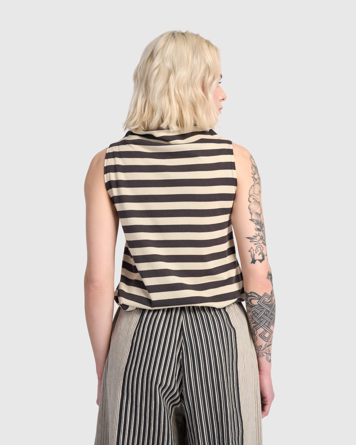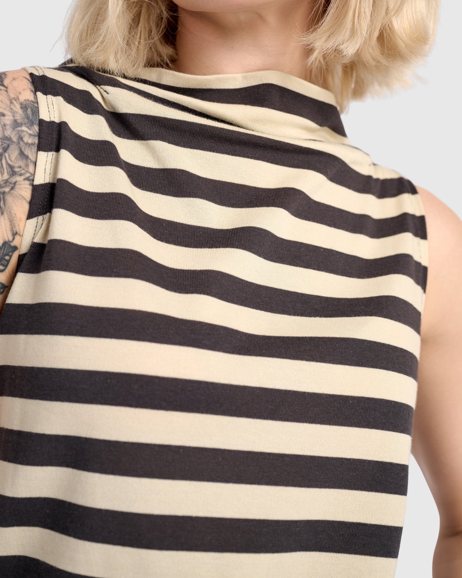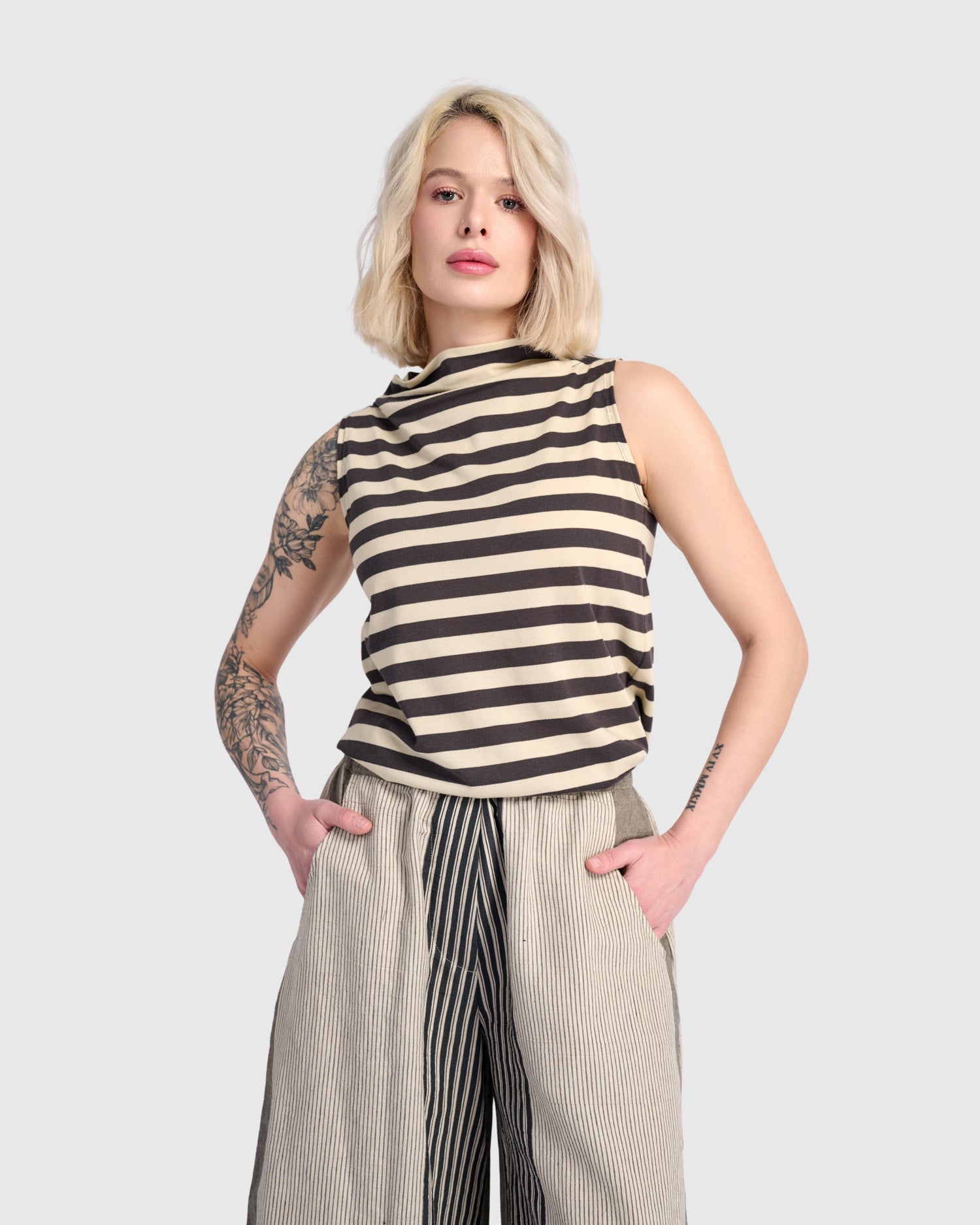The Cream Macha Top keeps things clean and modern with bold horizontal stripes and a softly draped neckline. Sleeveless and easy to wear, it brings quiet polish with just enough graphic edge.