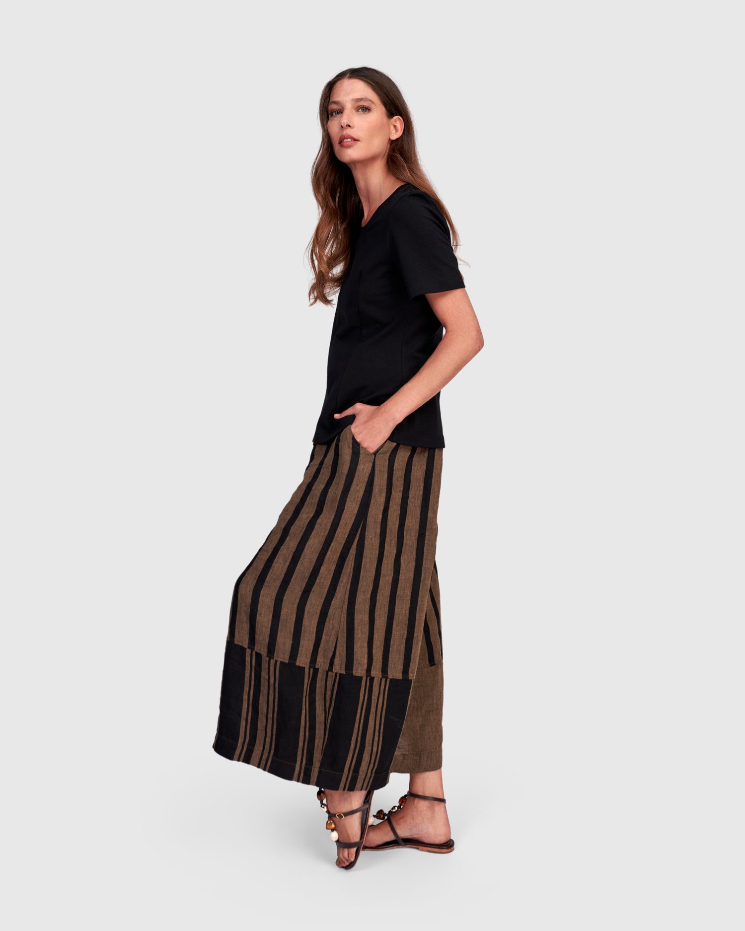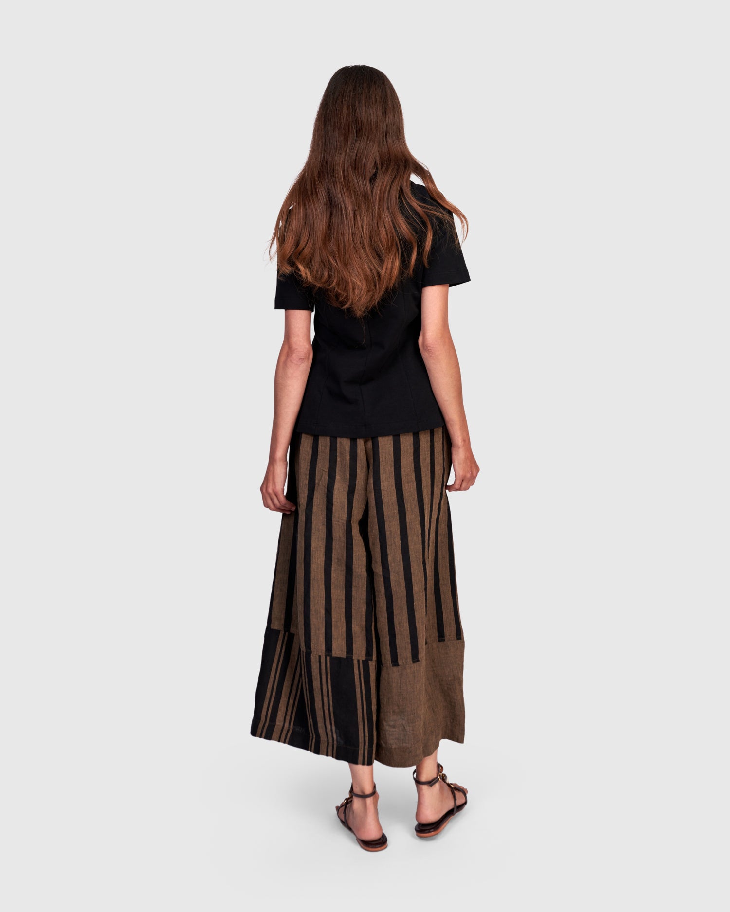 A striking mix of stripe directions and earthy contrast tones gives the Terra Trousers their quiet statement. The wide-leg cut and fluid shape create ease with unmistakable character.